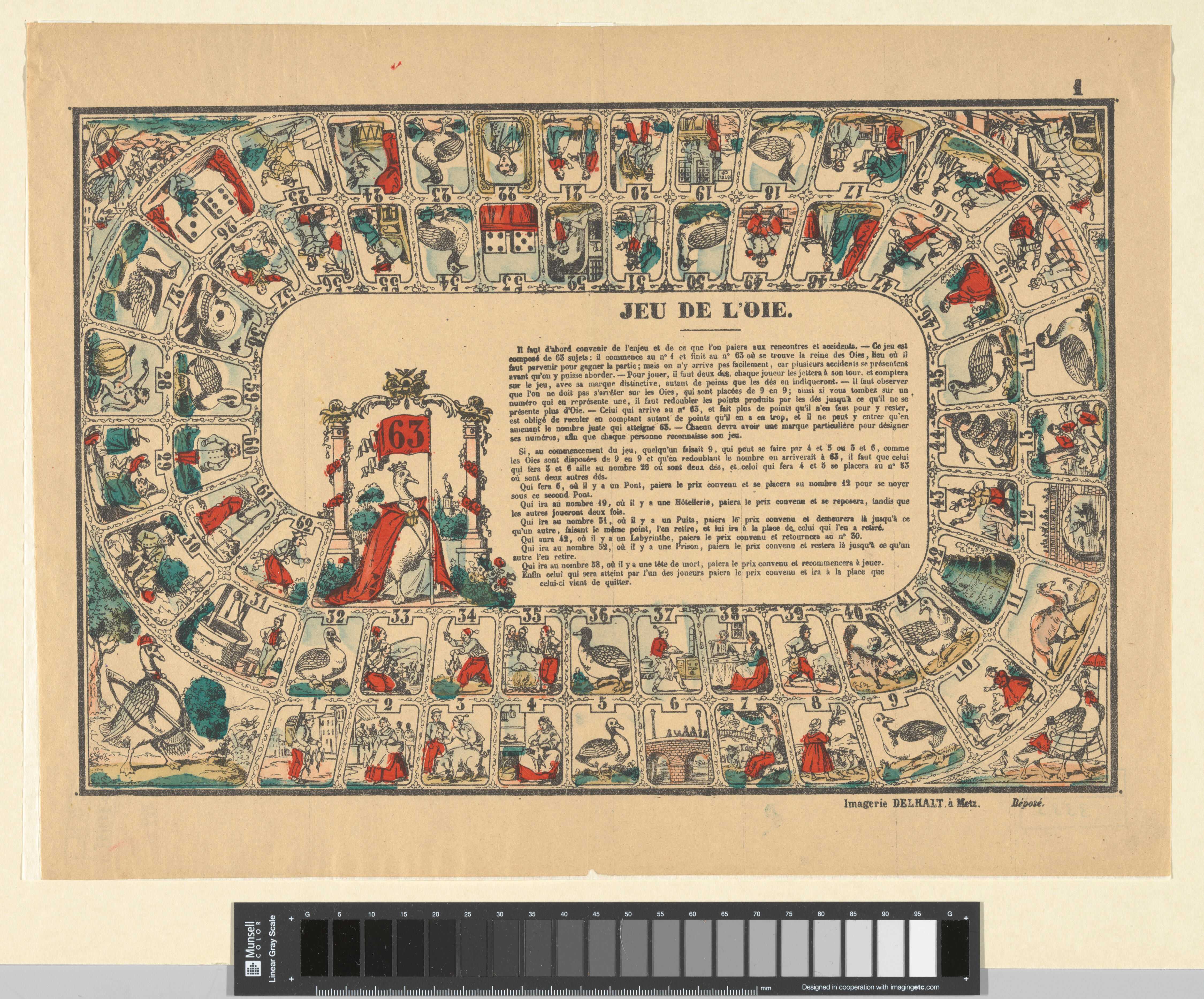 Ganzenbordspel met 63 speelvakken en in het midden de spelregels in het Frans.