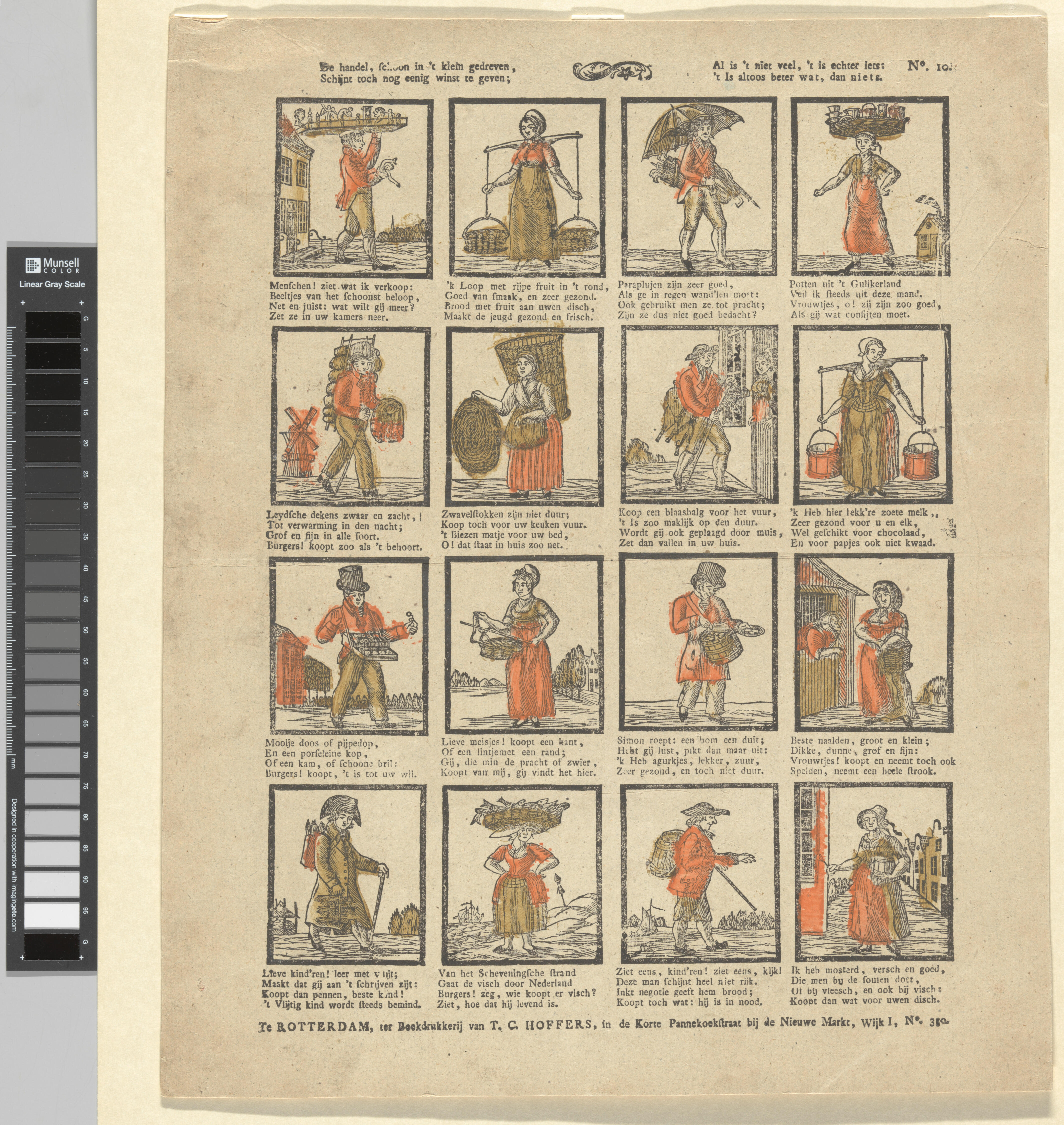 Prent met zestien voorstellingen van straatverkopers, gedrukt met houtsneden op lompenpapier en ingekleurd met geel en oranje. Elke afbeelding heeft een vierregelig onderschrift. De prent is uitgegeven door T.C. Hoffers in Rotterdam. De drukblokken zijn gegraveerd door Christiaan Jacob Schuyling.