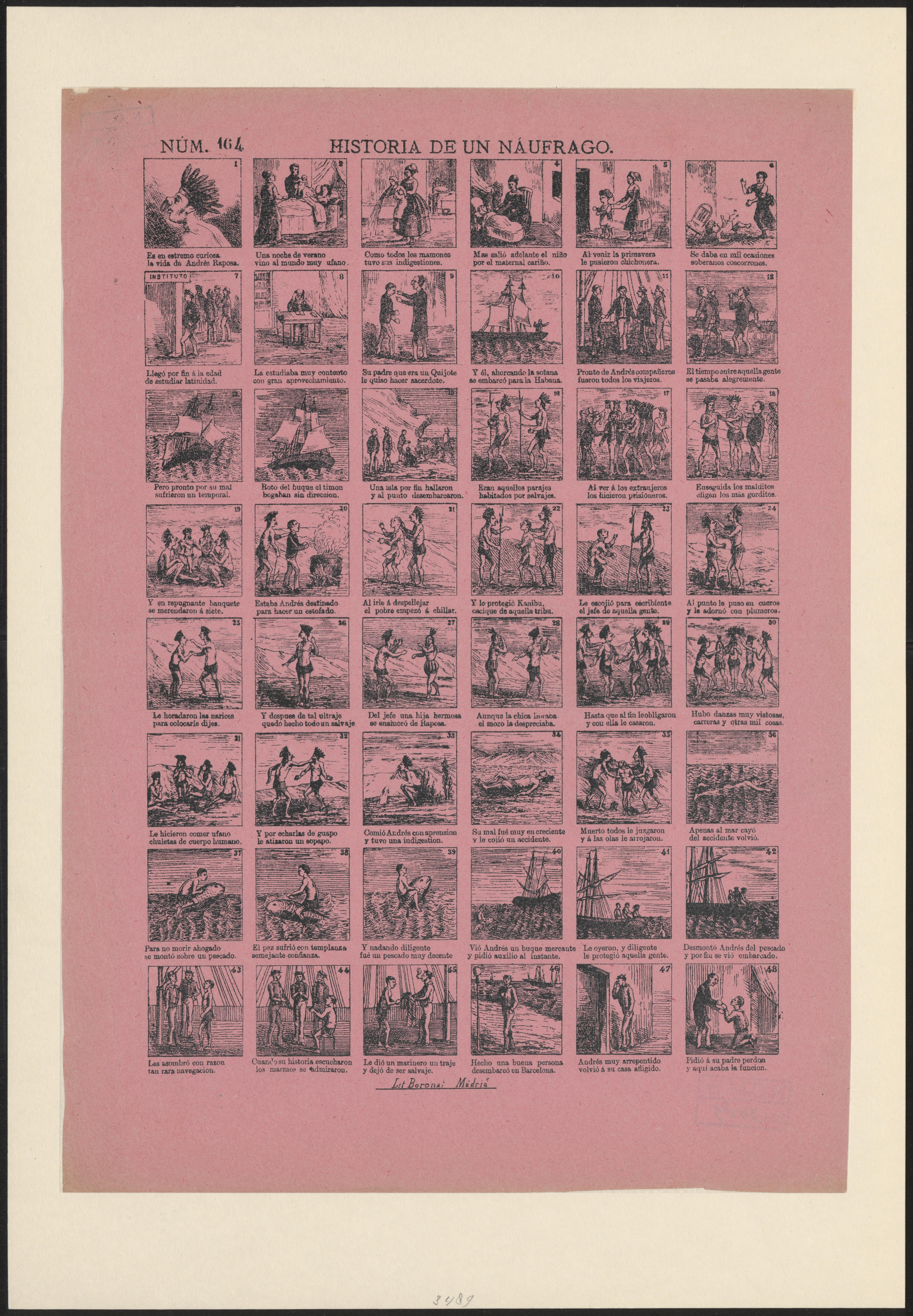 De prent is in de tweede helft van de negentiende eeuw uitgegeven door Boronai in Madrid, Spanje. De teksten zijn in het Spaans. De vertaling van de titel 'Historia de un Náufrago' luidt: 'Verhaal van een schipbreukeling'. De prent is een lithografie, gedrukt op roze-lila papier. De afbeeldingen zijn genummerd.
