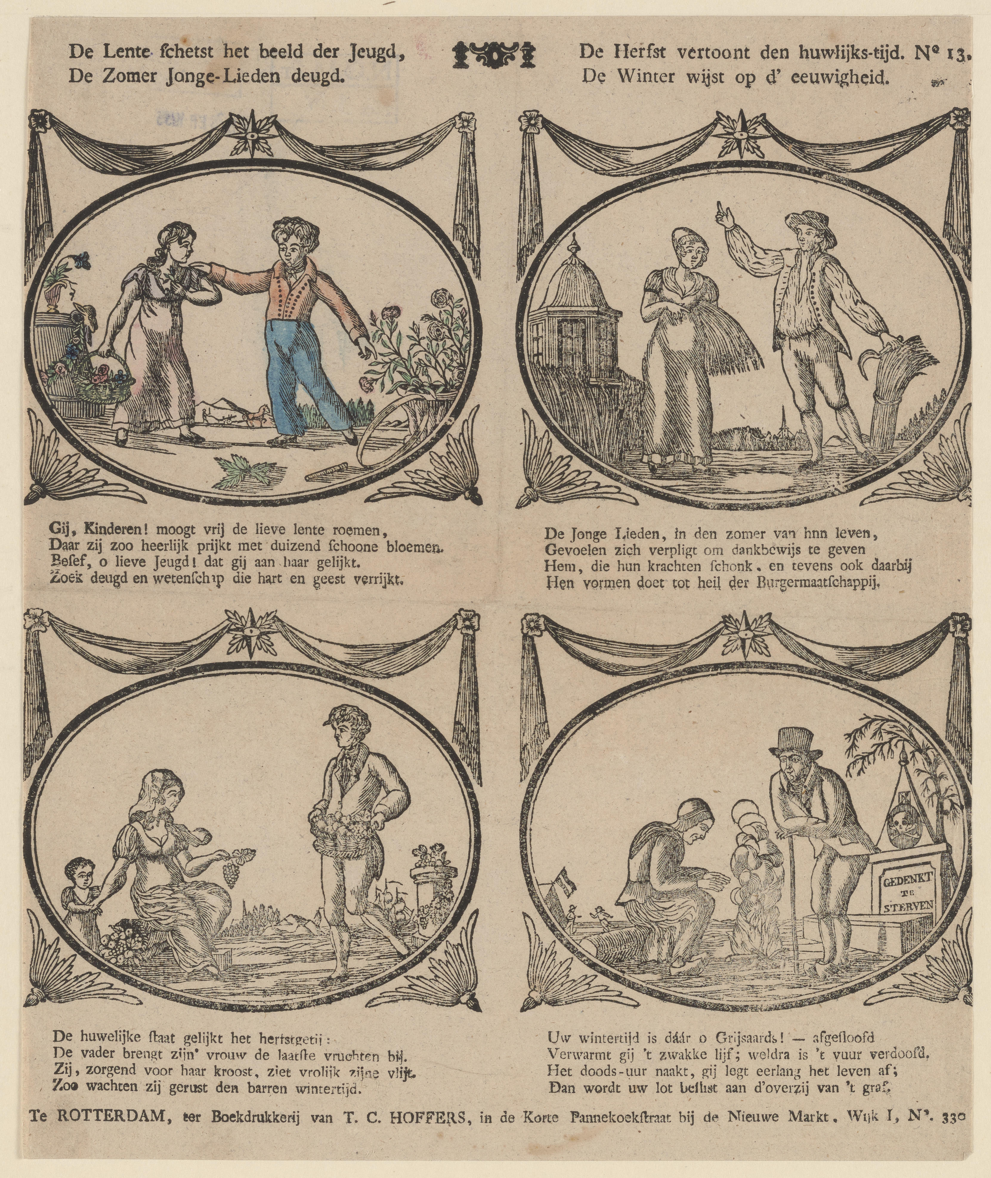 De Lente schetst het beeld der Jeugd, / De Zomer Jonge-Lieden deugd. // De Herfst vertoont den Huwlijks-tijd. / De Winter wijst op d' eeuwigheid. - No.13