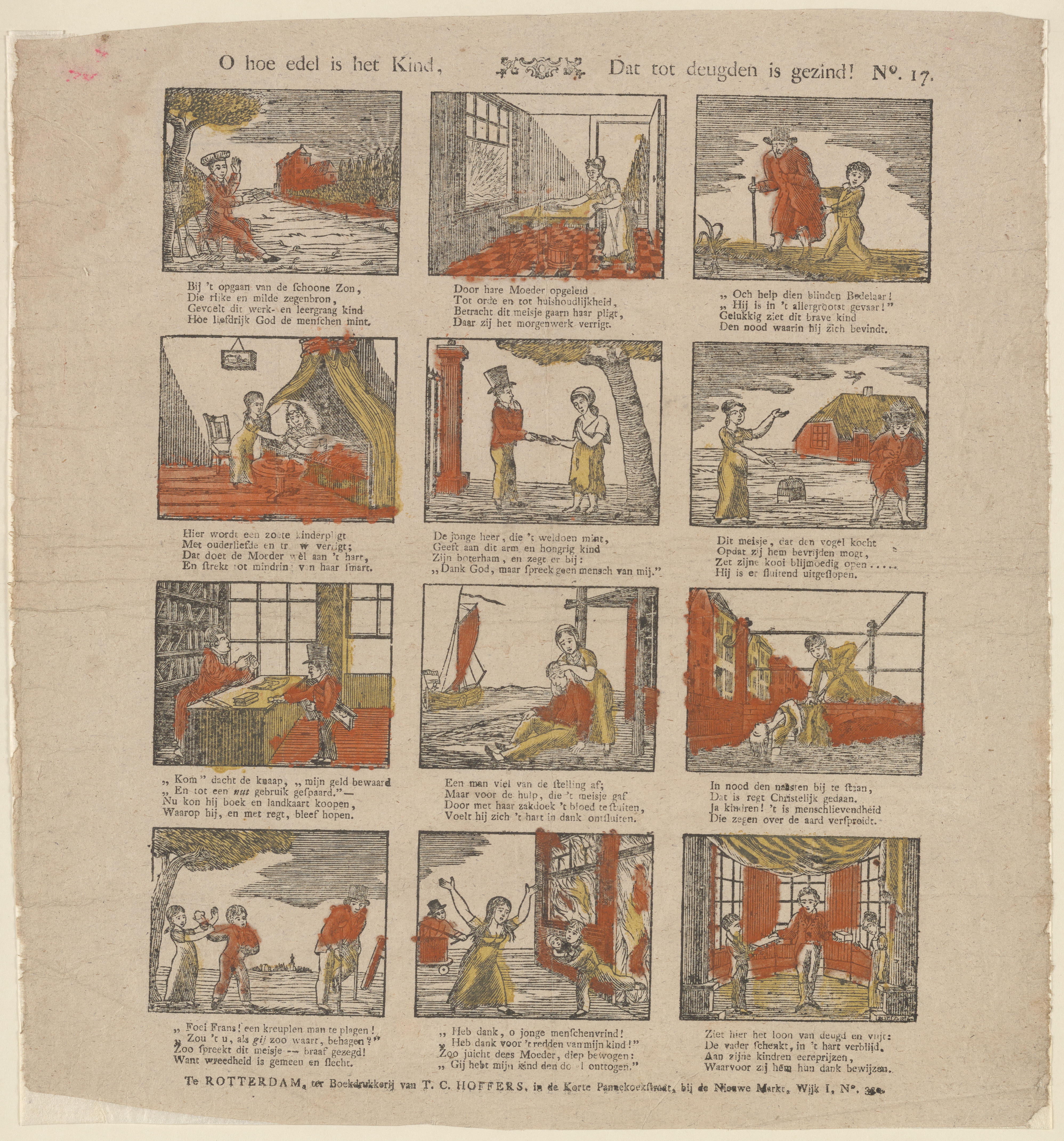 Prent met twaalf voorstellingen van verschillende deugden en gebeurtenissen, gedrukt met houtsneden op lompenpapier en ingekleurd met oranje en geel. Elke afbeelding heeft een onderschrift. De prent is uitgegeven door T.C. Hoffers in Rotterdam. De drukblokken zijn gegraveerd door Christiaan Jacob Schuyling.