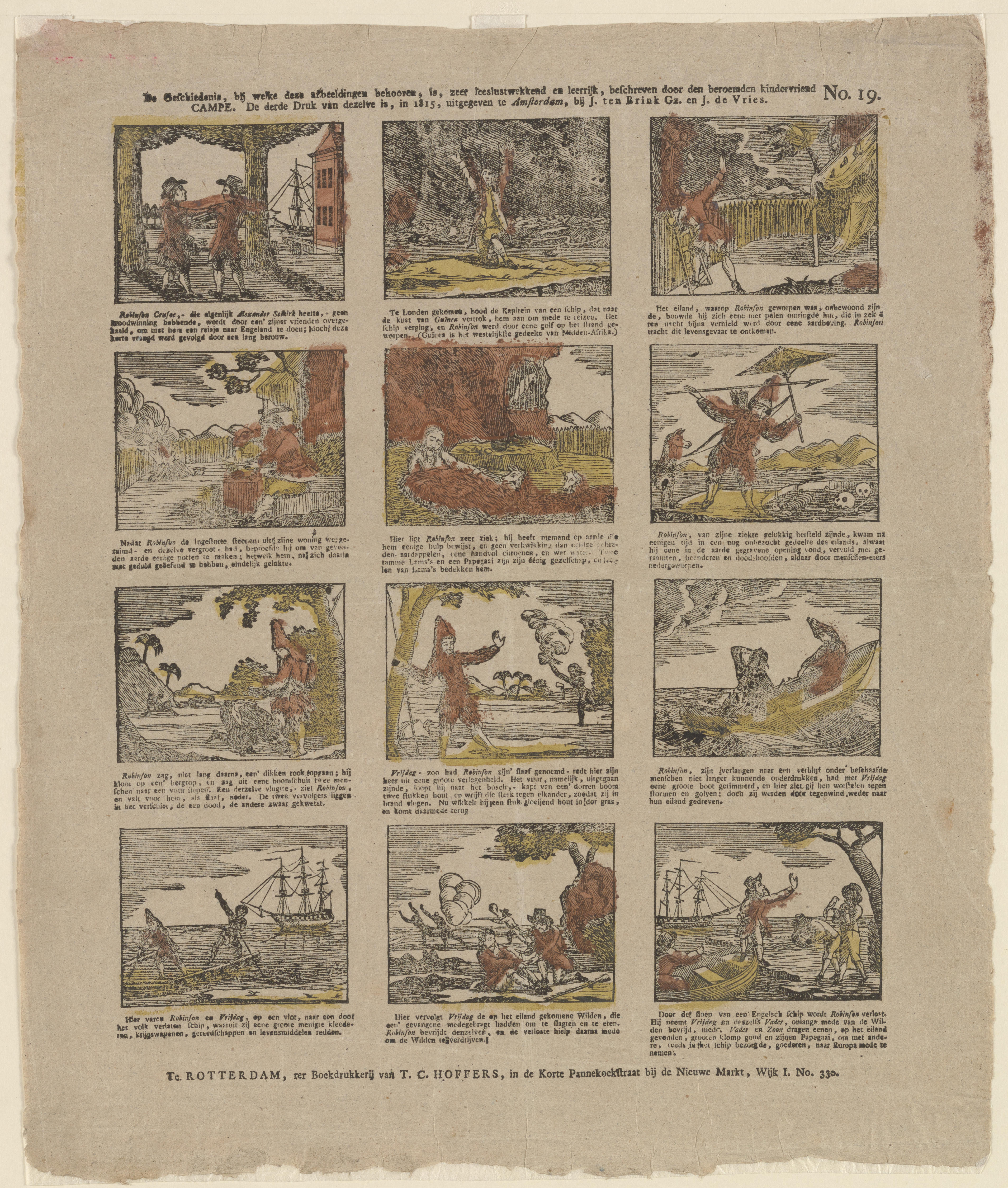 Prent met twaalf voorstellingen uit het verhaal van de schipbreukeling Robinson Crusoe, gedrukt met houtsneden op lompenpapier en ingekleurd met geel en oranjebruin. Elke afbeelding heeft een vierregelig onderschrift. De prent is uitgegeven door T.C. Hoffers in Rotterdam. De drukblokken zijn gegraveerd door Christiaan Jacob Schuyling.