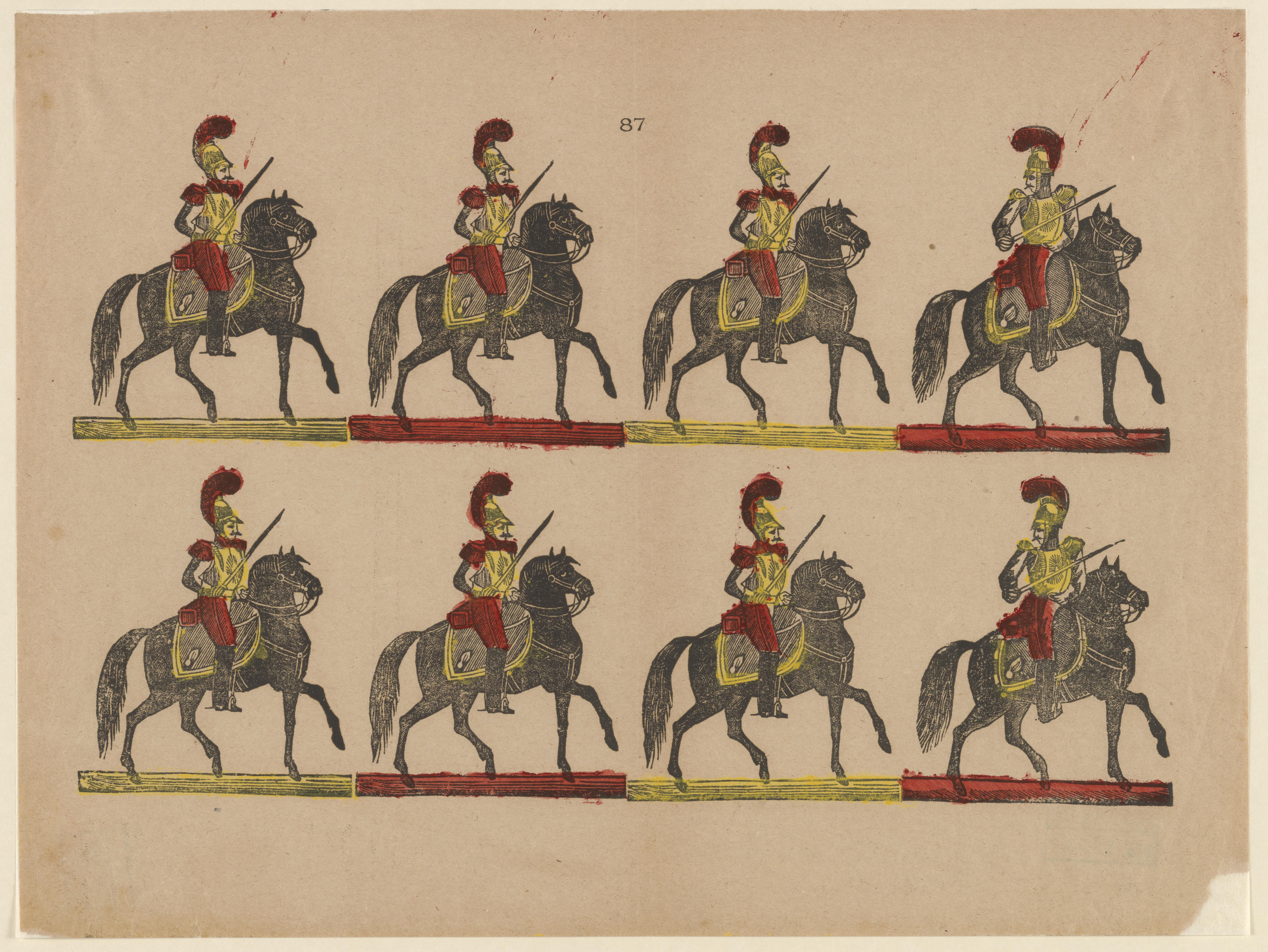 Prent met acht afbeeldingen van militairen te paard, gedrukt met afzonderlijke houtsneden en ingekleurd met rood en geel. De prent heeft geen titel. Op de prent staat geen uitgever vermeld, maar hij is toegeschreven aan Hemeleers van Houter in Schaarbeek.