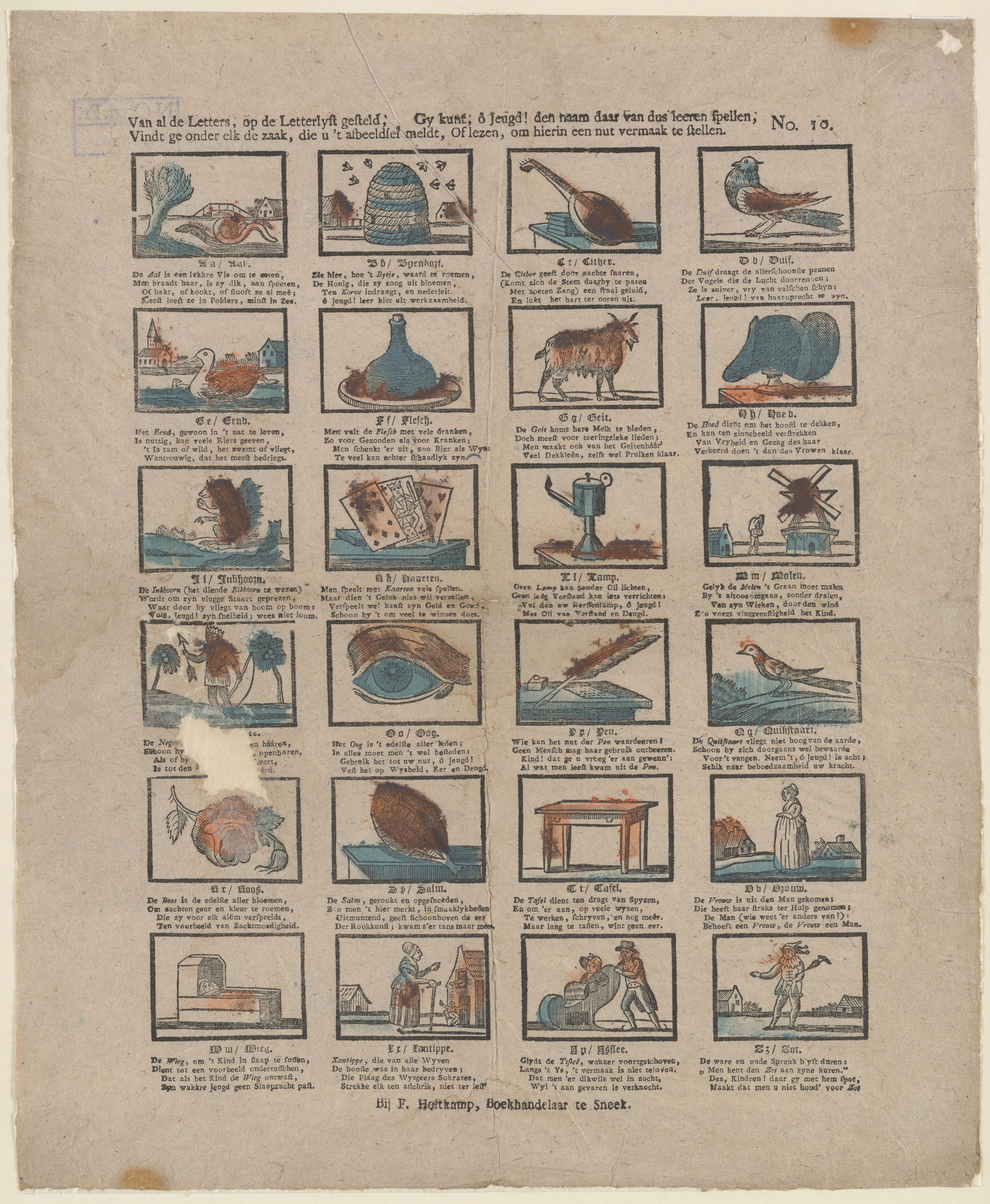 Van al de Letters, op de Letterlijst gesteld, // Vindt ge onder elk de zaak, die u 't afbeeldsel meldt - Gy kunt, o Jeugd! den naam daar van dus leeren spellen; // Of lezen, om hierin een nut vermaak te stellen. - No. 10