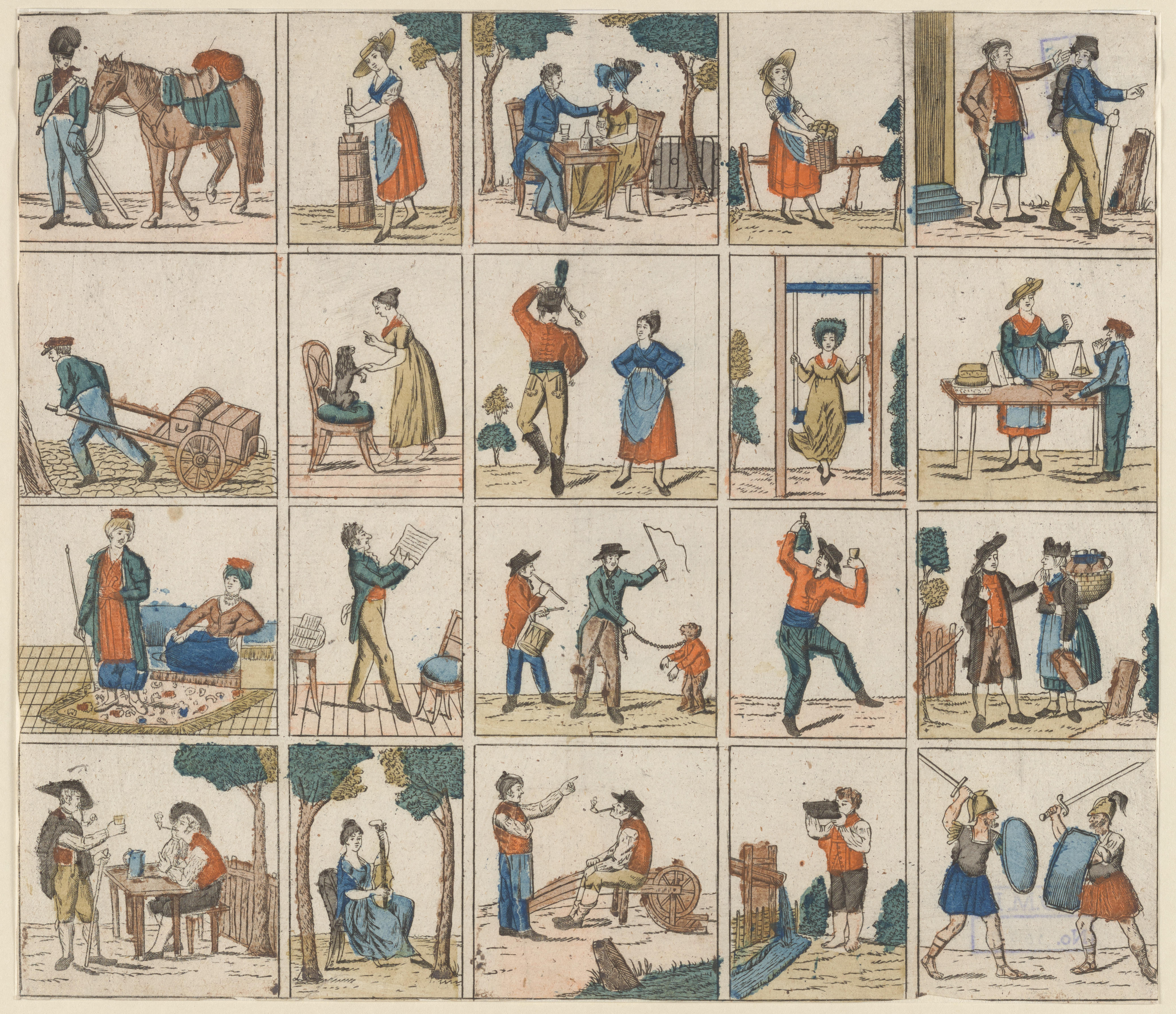 Prent met twintig afbeeldingen van personages en bezigheden, gedrukt in lithografie en ingekleurd in diverse kleuren. Op de prent is geen uitgever vermeld.