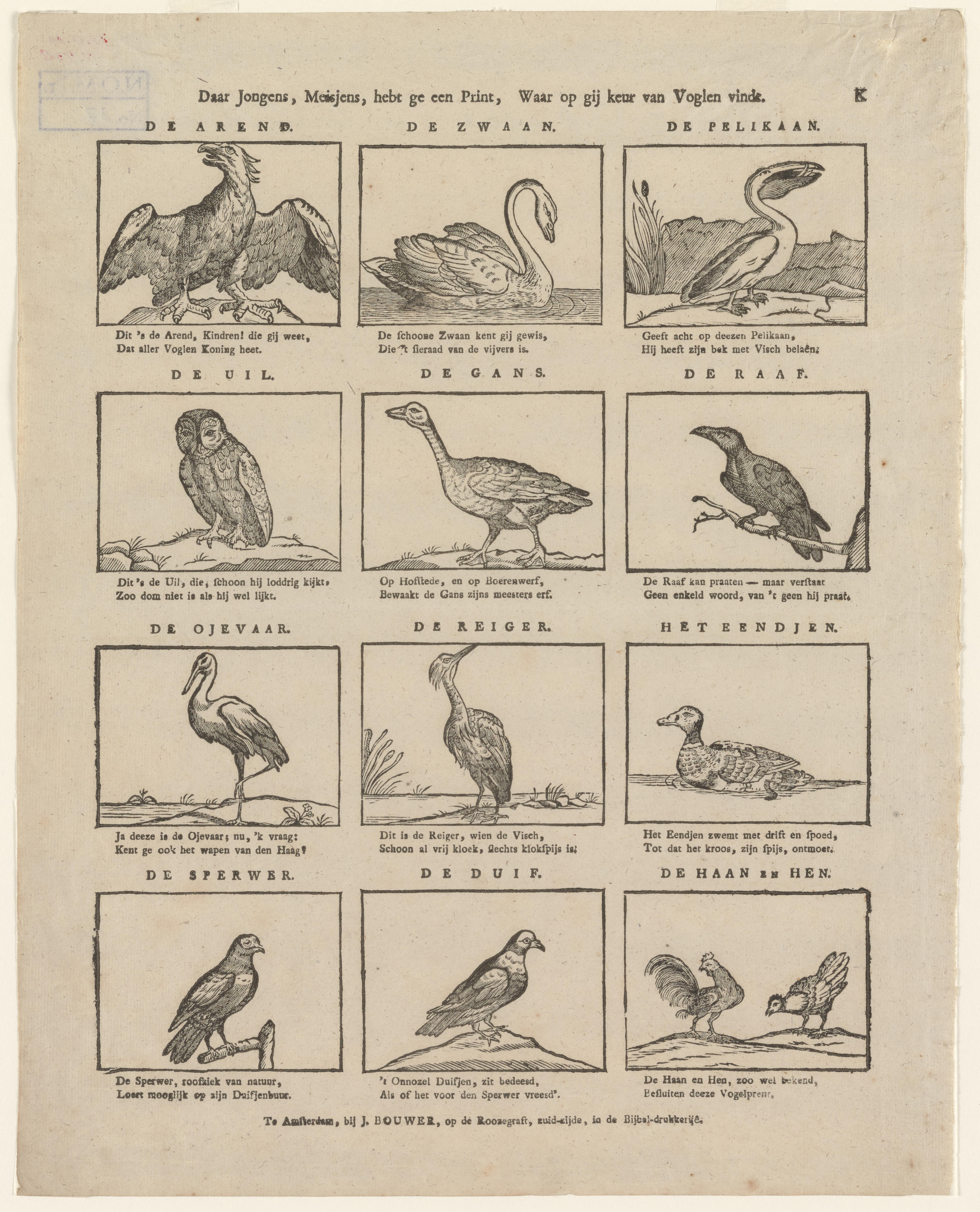 Prent met twaalf voorstellingen van vogels, gedrukt met afzonderlijke houtsneden. Boven elke afbeelding staat de naam van het dier, onder elke afbeelding een tweeregelig vers, gedrukt in boekdruk.