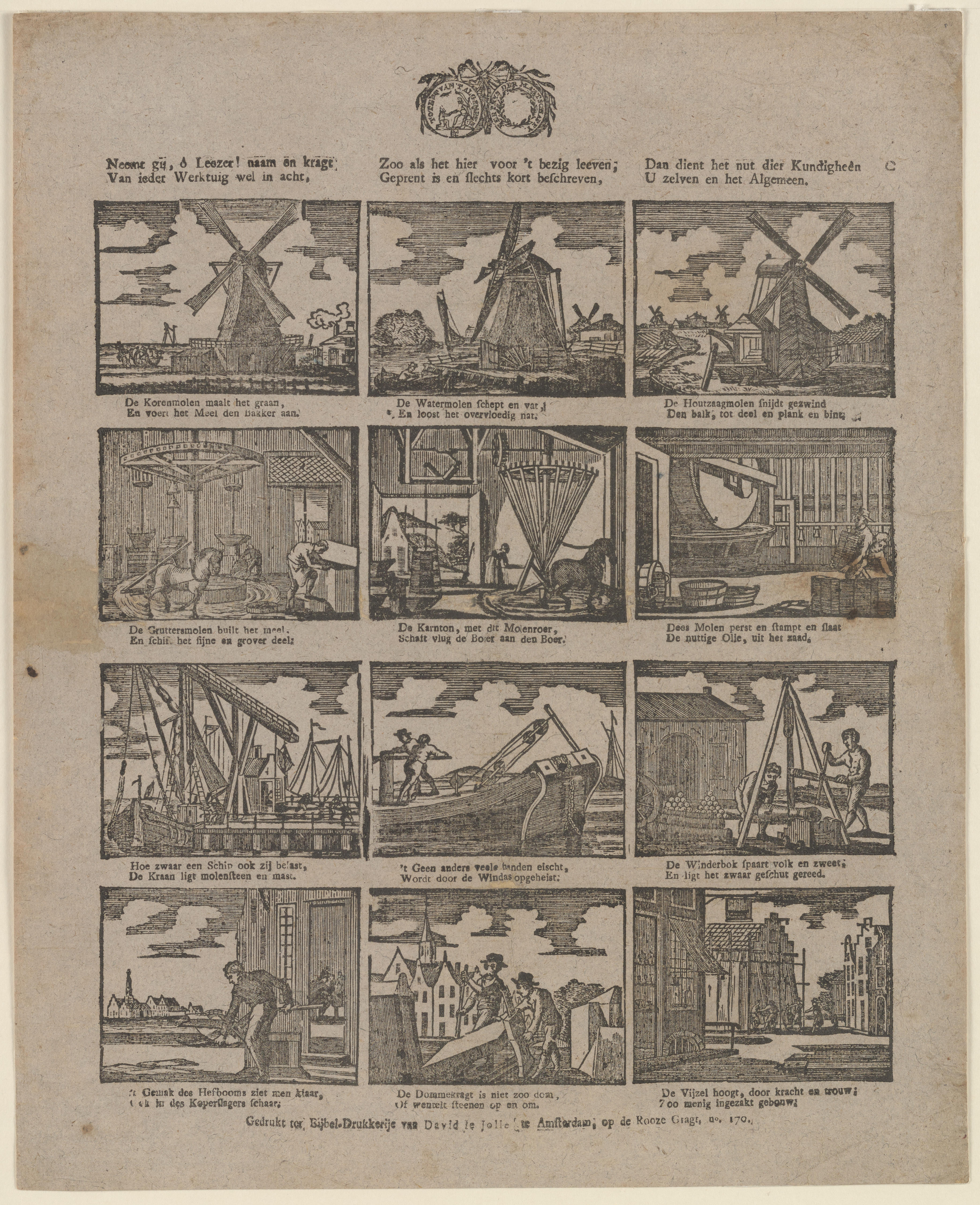 Prent met twaalf voorstellingen van verschillende werktuigen en machines, zoals windmolens, rosmolens en hefwerktuigen. De afbeeldingen zijn gedrukt met afzonderlijke houtsneden. Onder elke afbeelding staat een tweeregelig onderschrift in boekdruk.