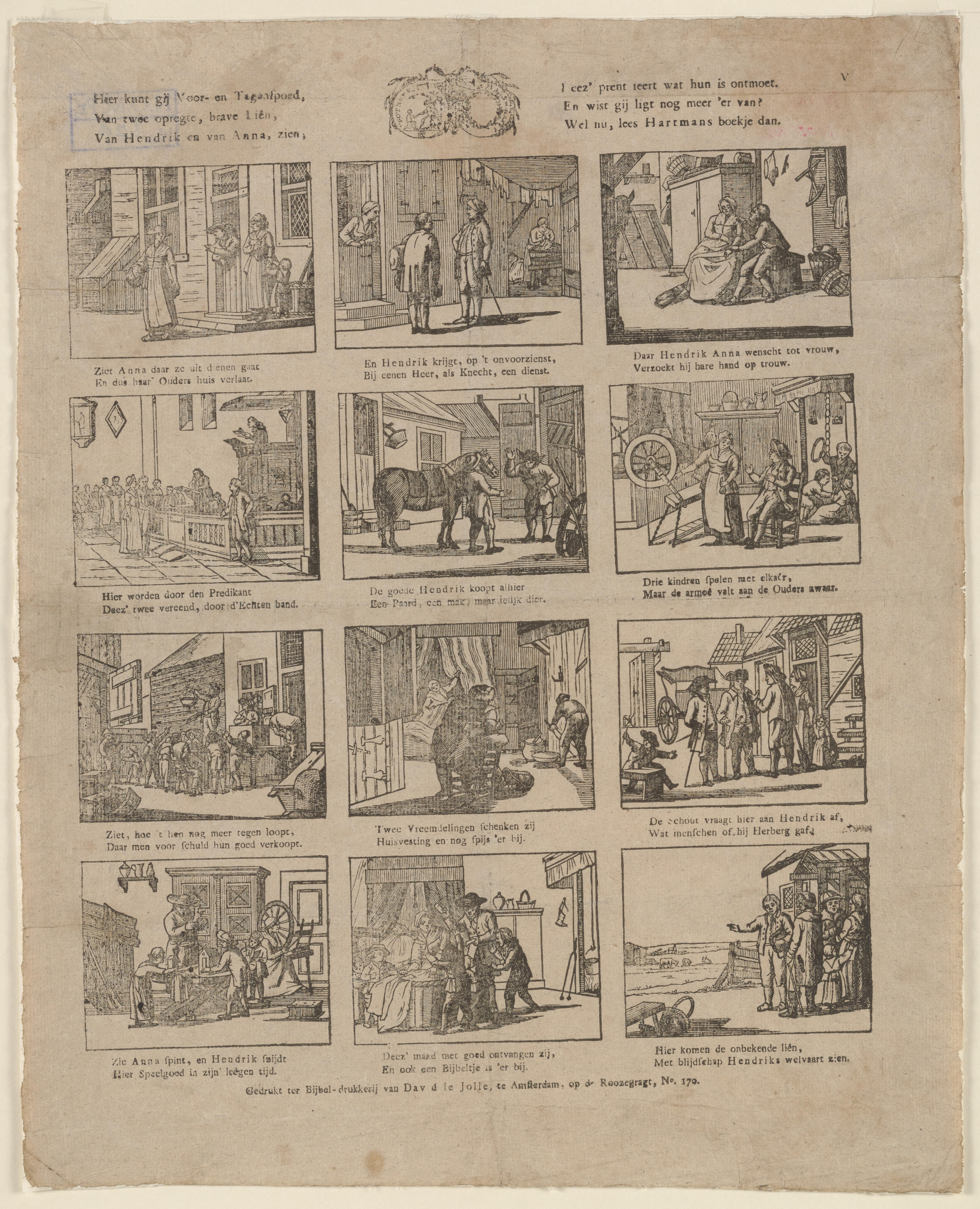 Prent met twaalf voorstellingen uit het verhaal van Hendrik en Anna, gedrukt met afzonderlijke houtsneden. Onder elke afbeelding staat een tweeregelig onderschrift in boekdruk.
