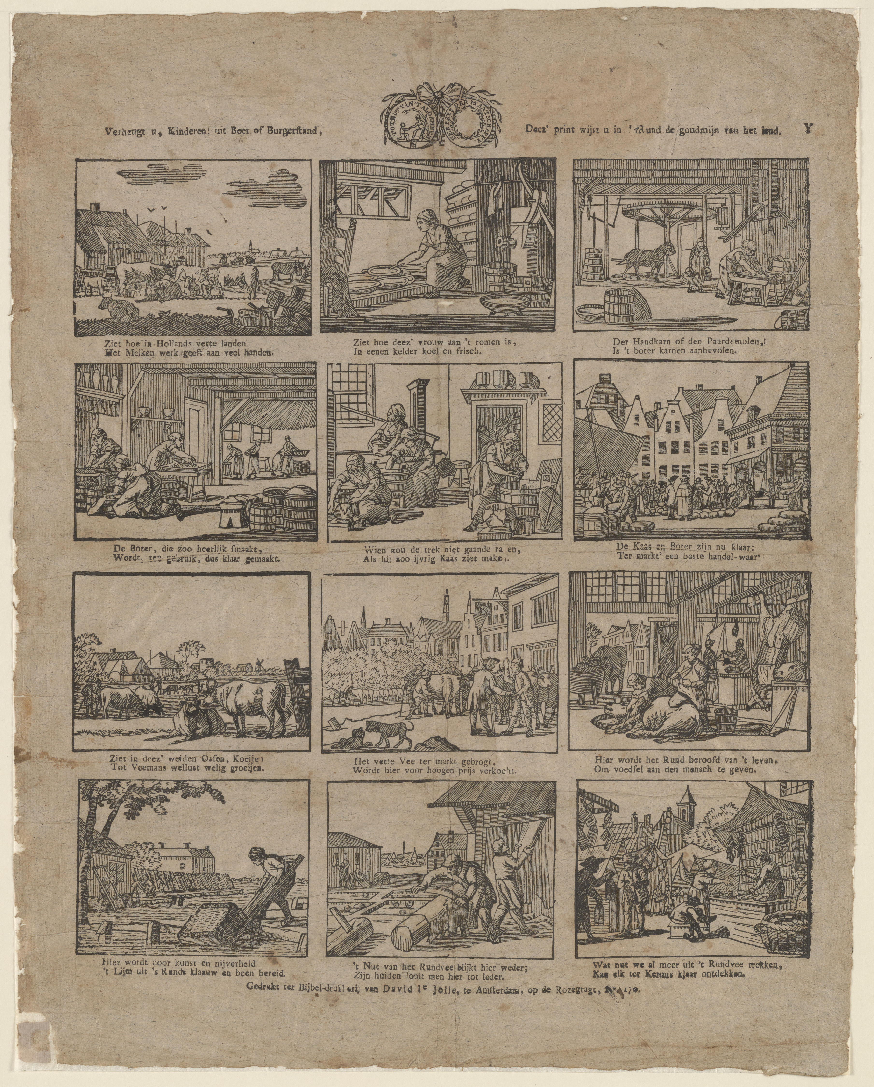 Prent met twaalf voorstellingen waarin het nut van het rund is verbeeld, gedrukt met afzonderlijke houtsneden. Bovenaan zijn zes voorstellingen over zuivelproducten te zien; onderaan staan zes voorstellingen over andere producten van het rund zoals vlees, leer en lijm. Onder elke afbeelding staat een tweeregelig onderschrift in boekdruk.