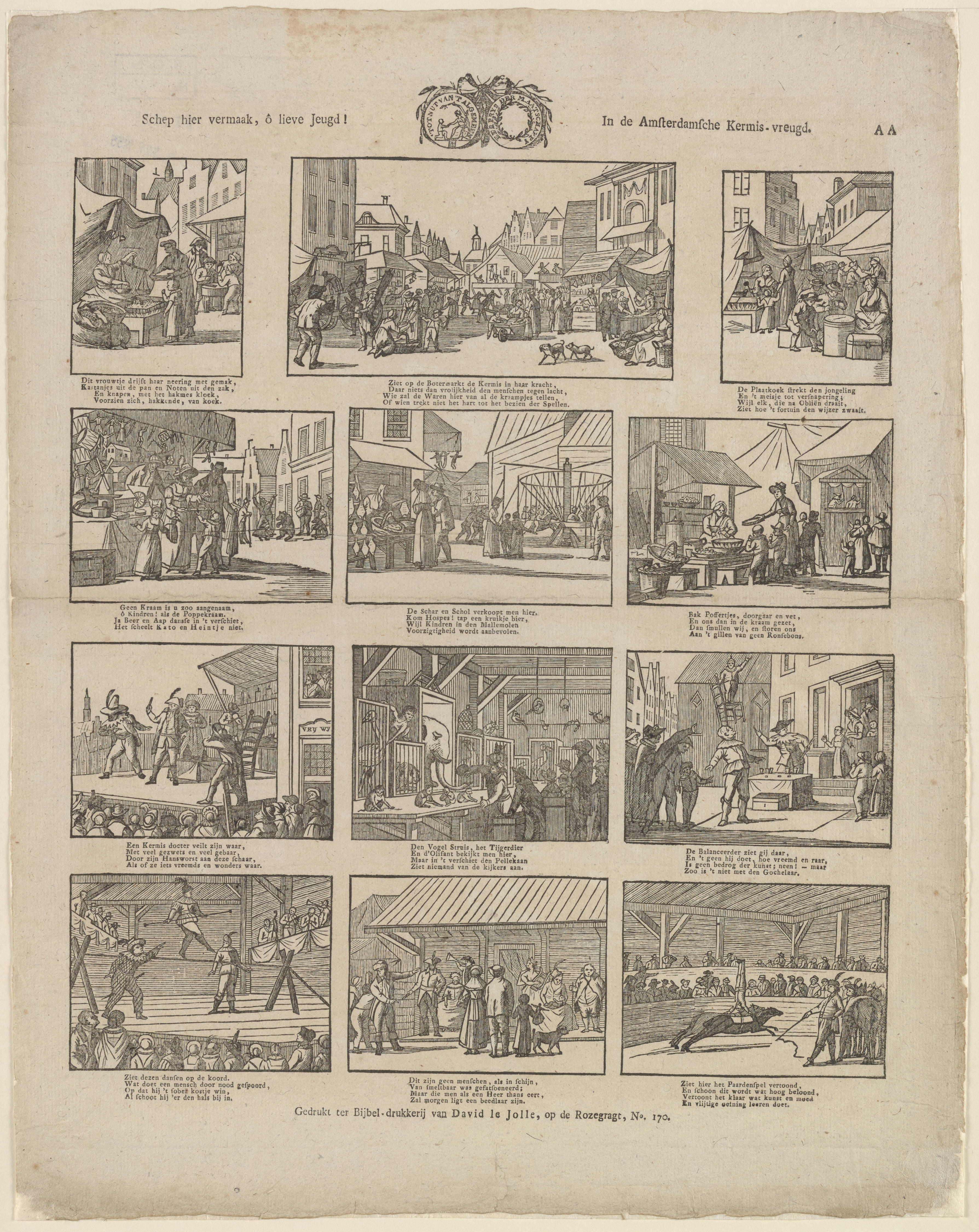 Prent met twaalf voorstellingen van de Amsterdamse kermis, gedrukt met afzonderlijke houtsneden. Onder elke afbeelding staat een vierregelig onderschrift in boekdruk.