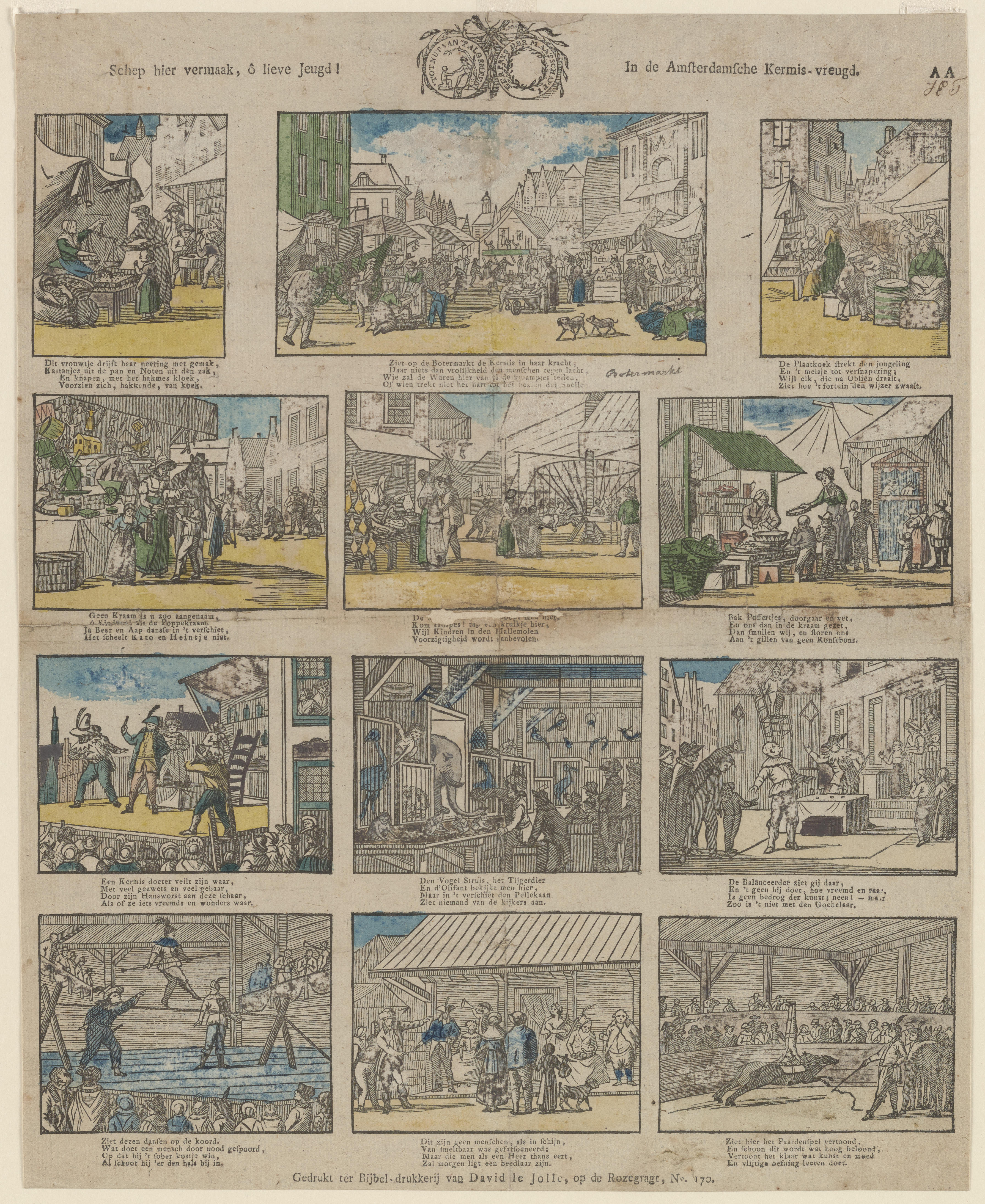 Prent met twaalf voorstellingen van de Amsterdamse kermis, gedrukt met afzonderlijke houtsneden en ingekleurd met blauw, groen en geel. Onder elke afbeelding staat een vierregelig onderschrift in boekdruk.
