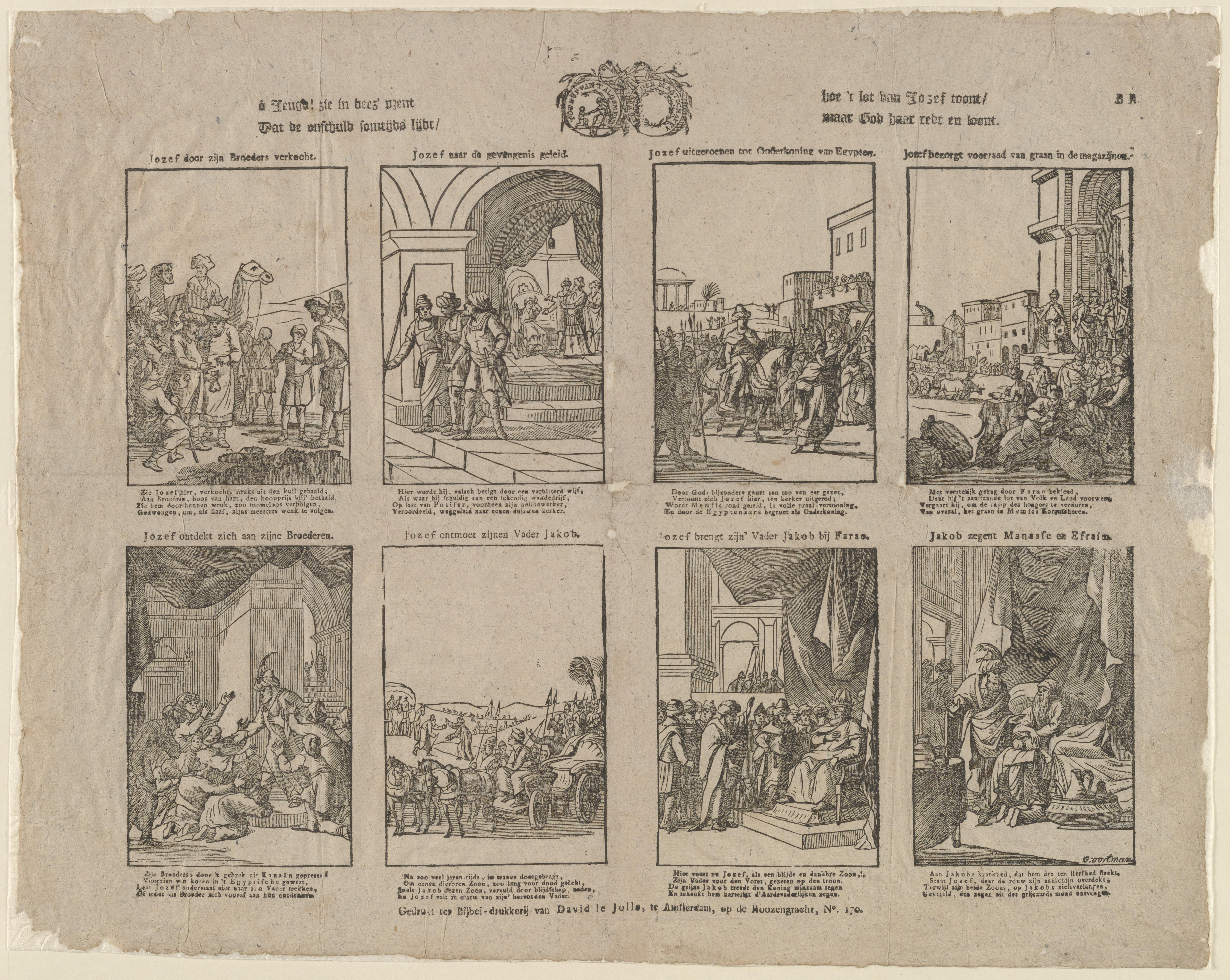 Prent met acht afbeeldingen uit het verhaal van Jozef, gedrukt met afzonderlijke houtsneden. Boven elke afbeelding staat een titel, onder elke afbeelding een vierregelig vers, gedrukt in boekdruk. In de achtste afbeelding staat de signatuur van graveur Gerrit Oortman.