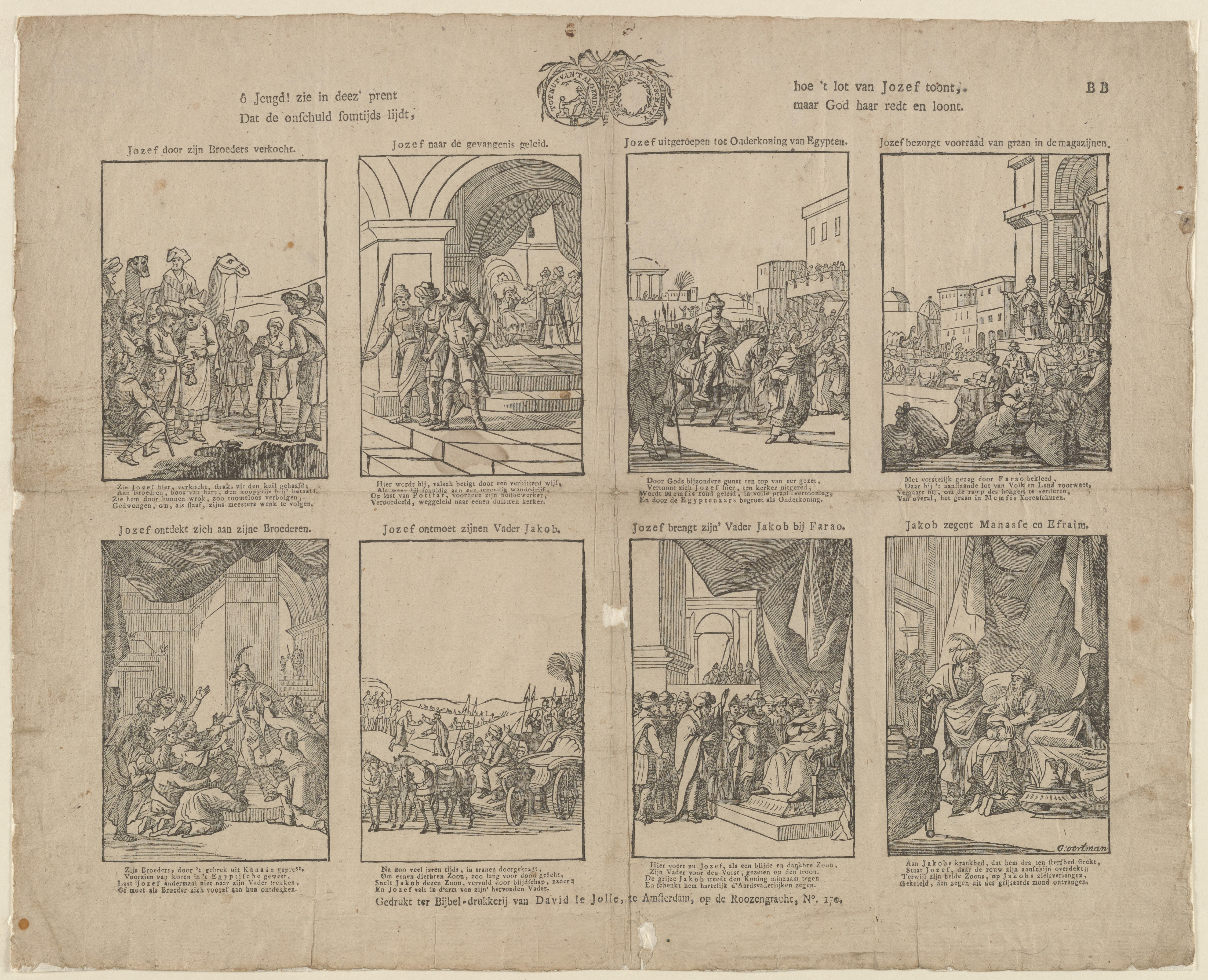 Prent met acht afbeeldingen uit het verhaal van Jozef, gedrukt met afzonderlijke houtsneden. Boven elke afbeelding staat een titel, onder elke afbeelding een vierregelig vers, gedrukt in boekdruk. In de achtste afbeelding staat de signatuur van graveur Gerrit Oortman.