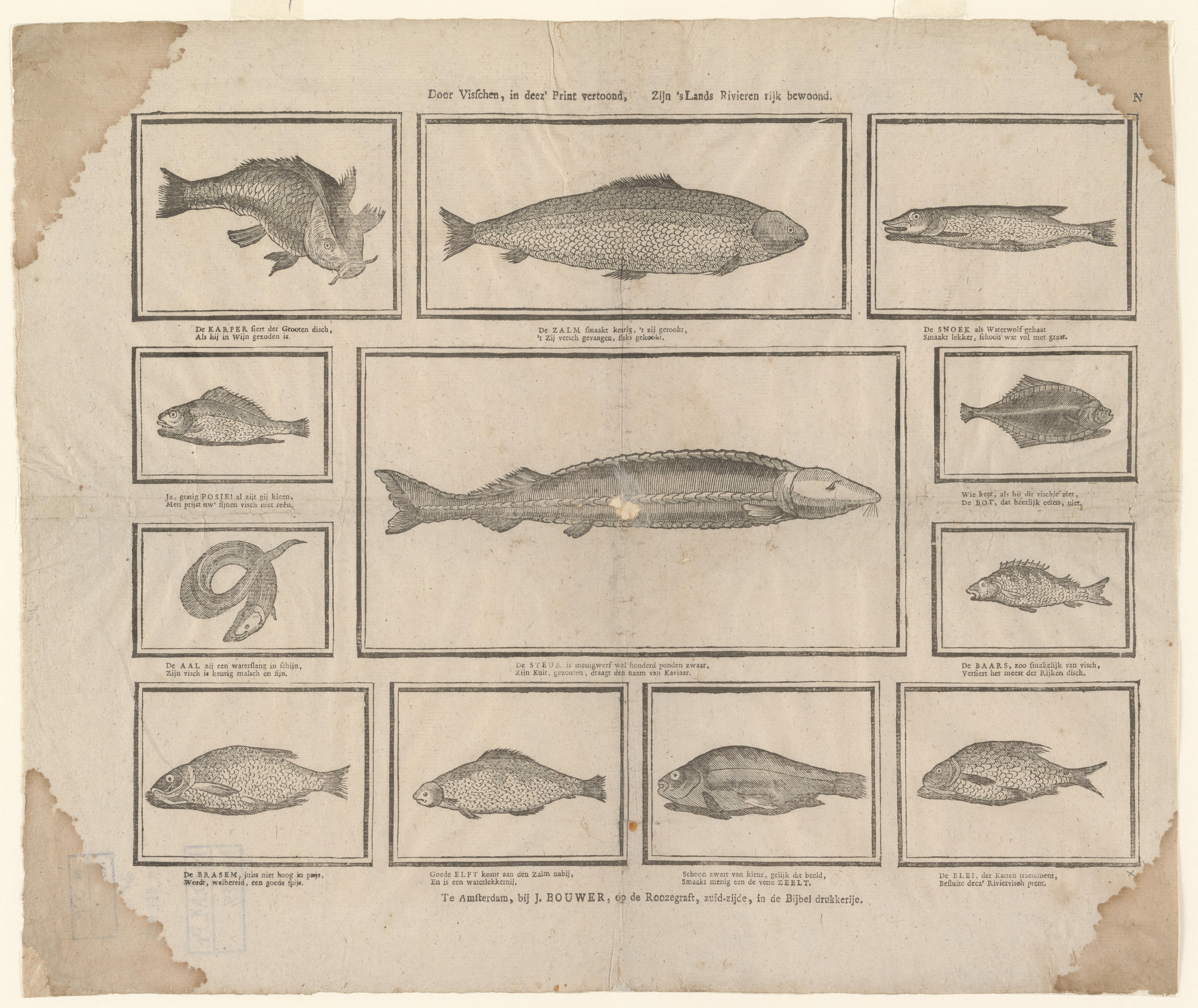 Door Visschen, in deez' Print vertoond, Zijn 's Lands Rivieren rijk bewoond. - N