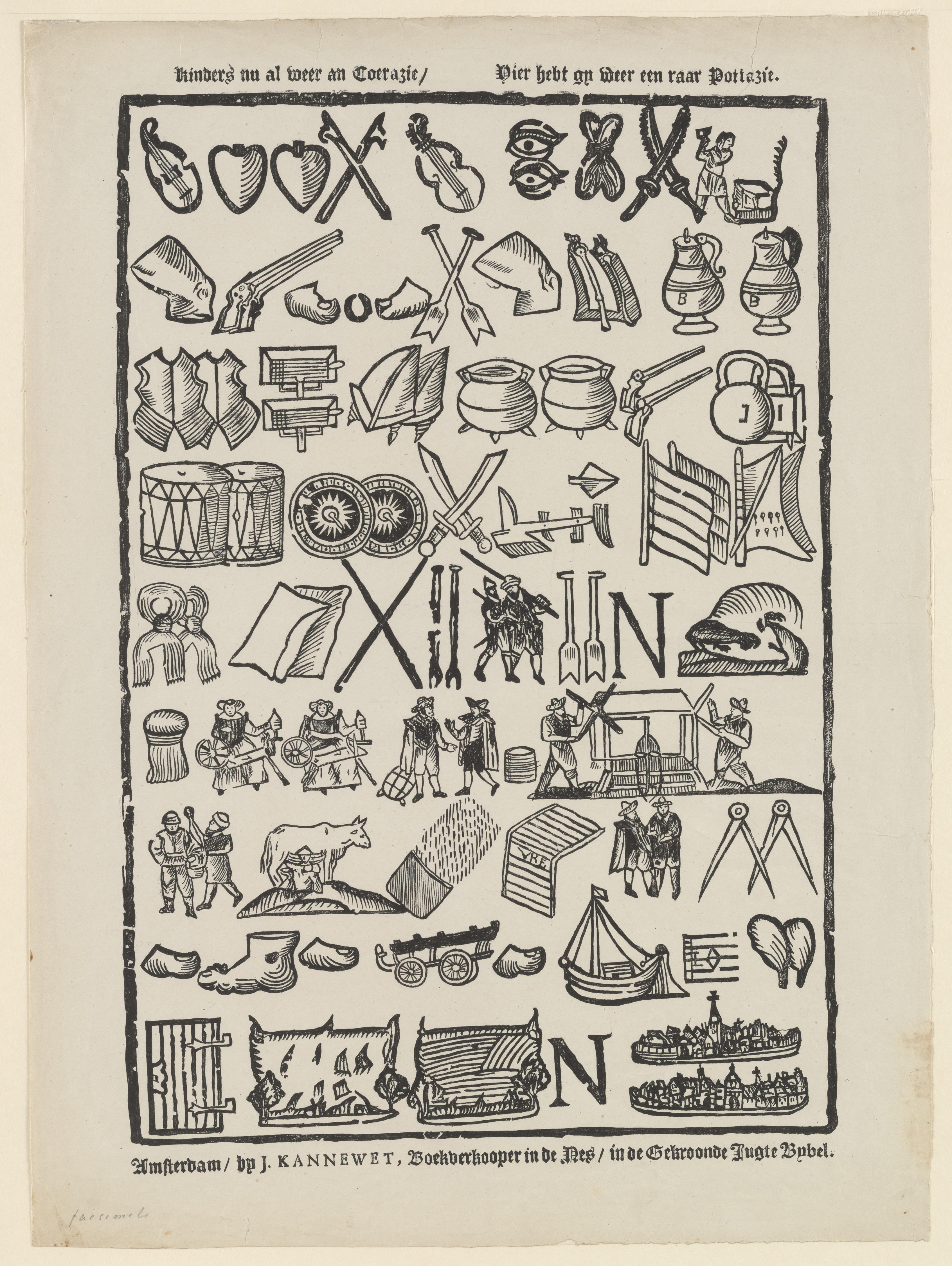 Prent met een rebus in negen rijen. De prent is een twintigste-eeuwse facsimile van een prent die tussen 1723 en 1780 werd uitgegeven door de Amsterdamse uitgever J. Kannewet. De rebusprent komt ook voor in het fonds van Izaak van der Putte.