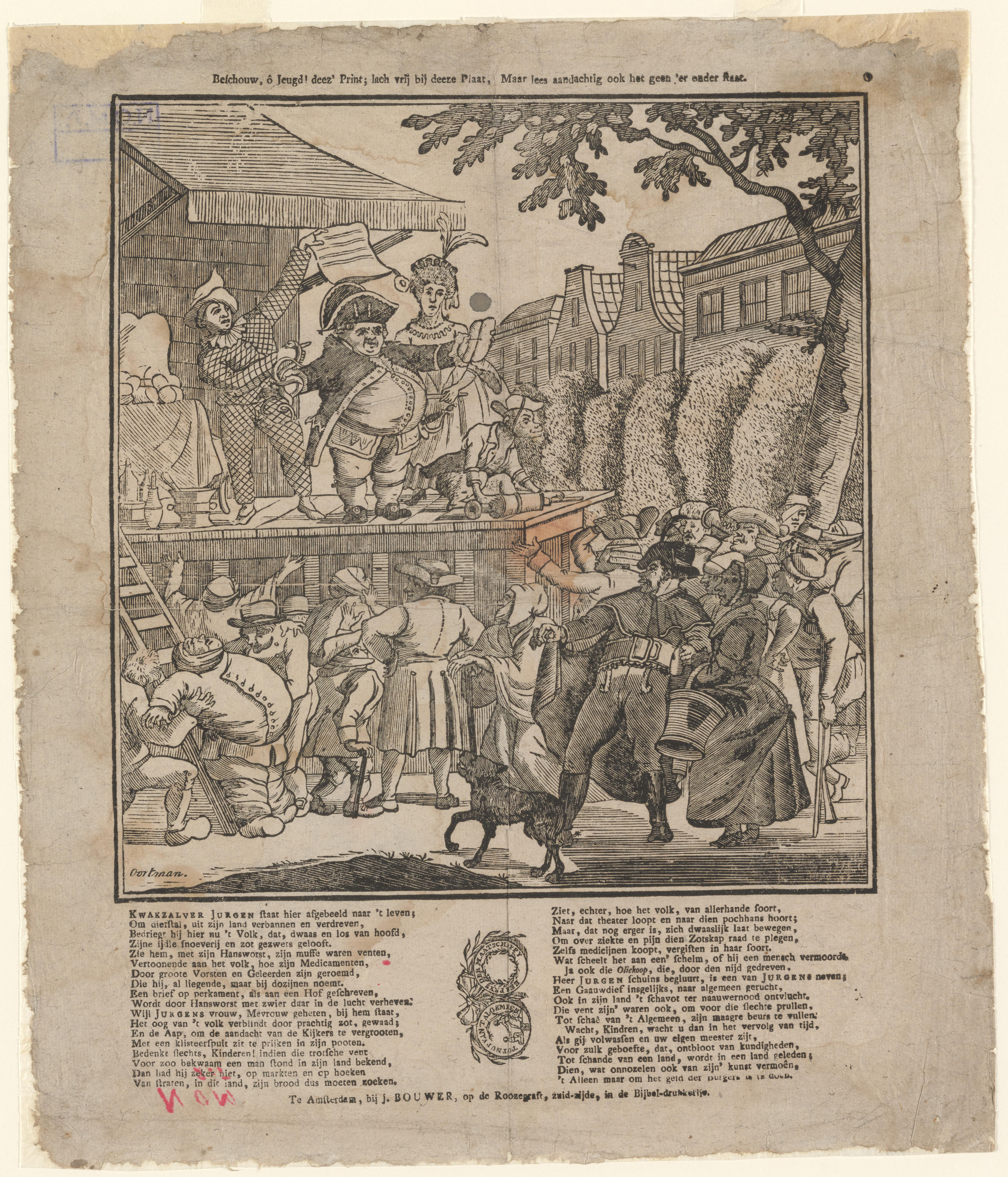 Prent met een voorstelling van kwakzalver Jurgen op de kermis. Op het podium voor het publiek prijst de kwakzalver samen met zijn handlangers, de harlekijn Hansworst, zijn vrouw en een aap met een klisteerspuit, zijn medicamenten aan. De afbeelding is gedrukt met een houtsnede. Onder de voorstelling staat een vers in twee kolommen, gedrukt in ...