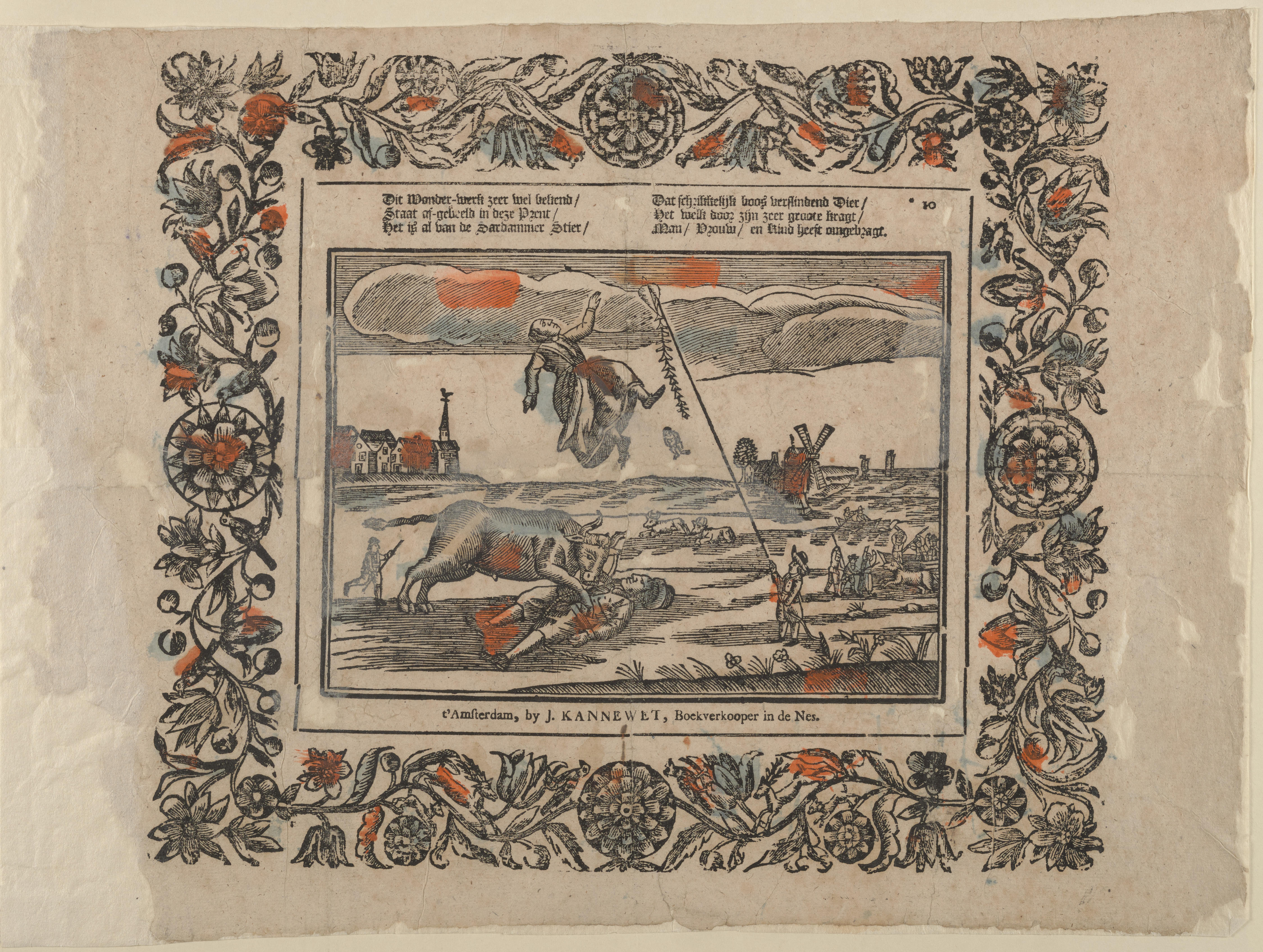 Prent met een afbeelding van het verhaal 'Stiers Wreedheid', omgeven door een bloemenkrans. De prent is gedrukt met een houtsnede en ingekleurd met rood en blauw. Op 29 augustus 1647 schrok een stier in West-Zaandam van een vlieger. De stier verwondde boer Jacob Egh die hem wilde bedwingen. Van Jacobs hoogzwangere vrouw Trijntje Jans reet ...