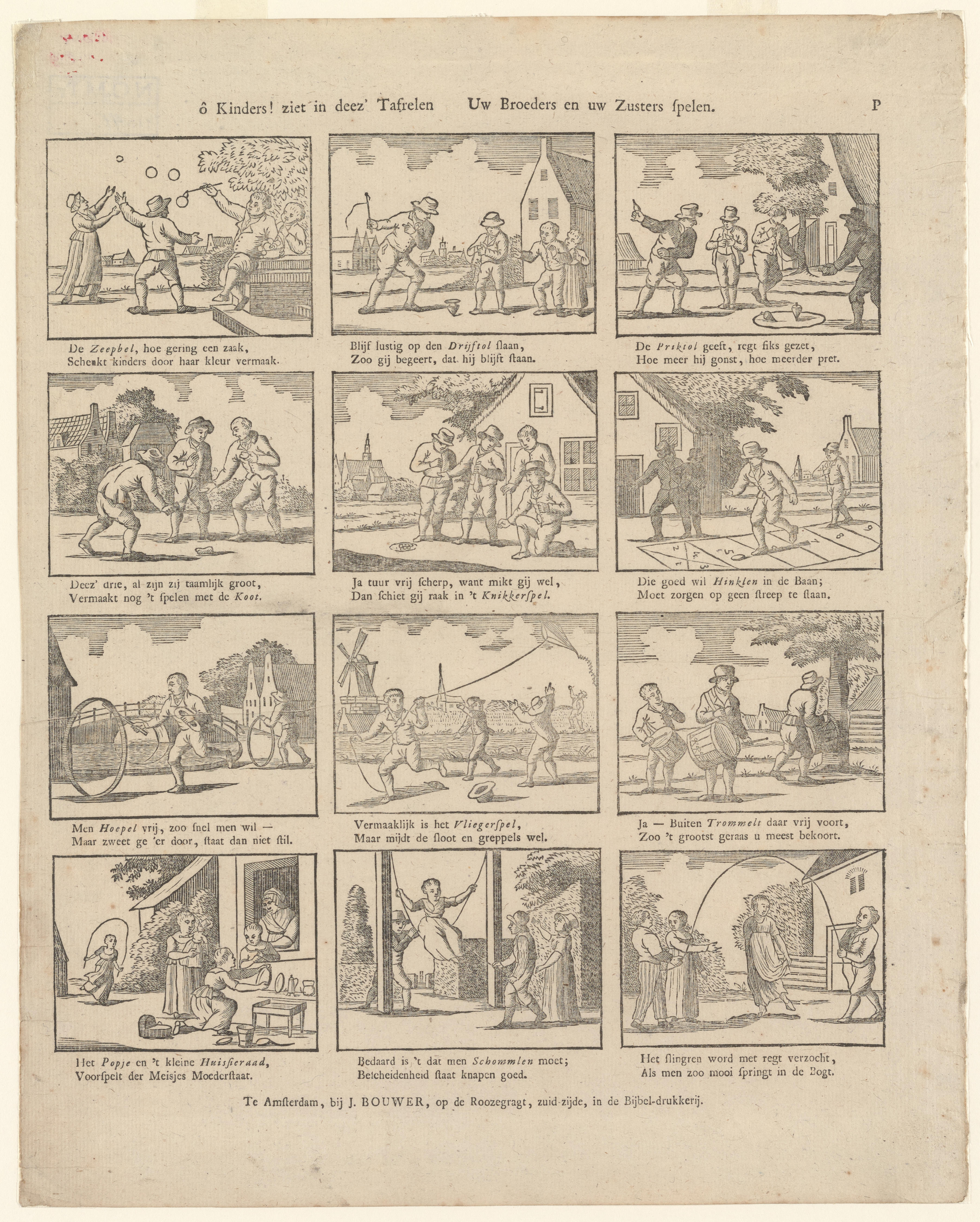 Prent met twaalf voorstellingen van kinderspelen, gedrukt met afzonderlijke houtsneden. Onder elke afbeelding staat een tweeregelig onderschrift in boekdruk.