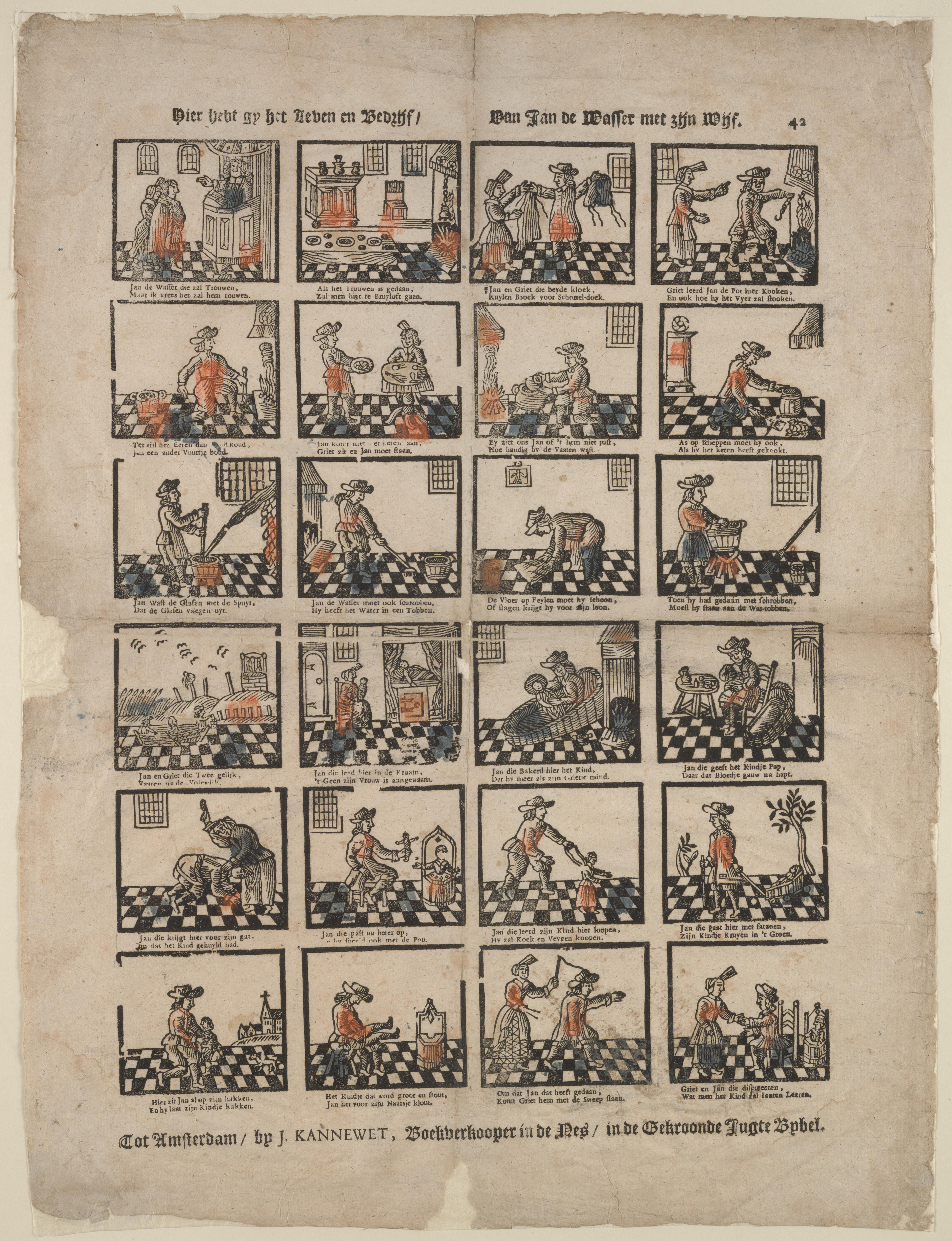 Prent met 24 voorstellingen uit het verhaal van Jan de Wasser, gedrukt met afzonderlijke houtsneden en ingekleurd met blauw en rood. Onder elke afbeelding staat een tweeregelig onderschrift.