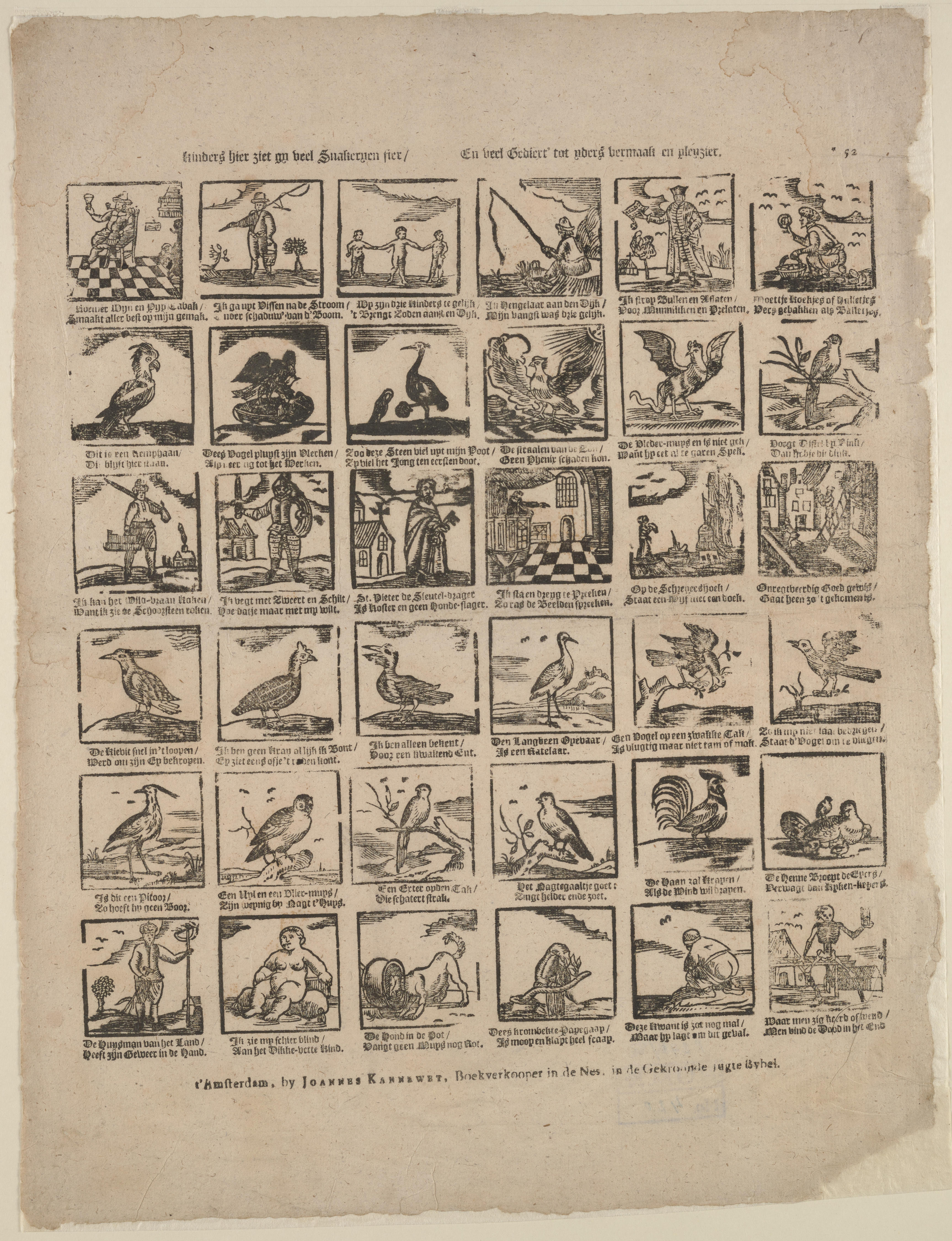 Prent met 36 afbeeldingen van dieren, voorwerpen en personages, gedrukt met afzonderlijke houtsneden. Onder elke afbeelding staat een tweeregelig onderschrift.