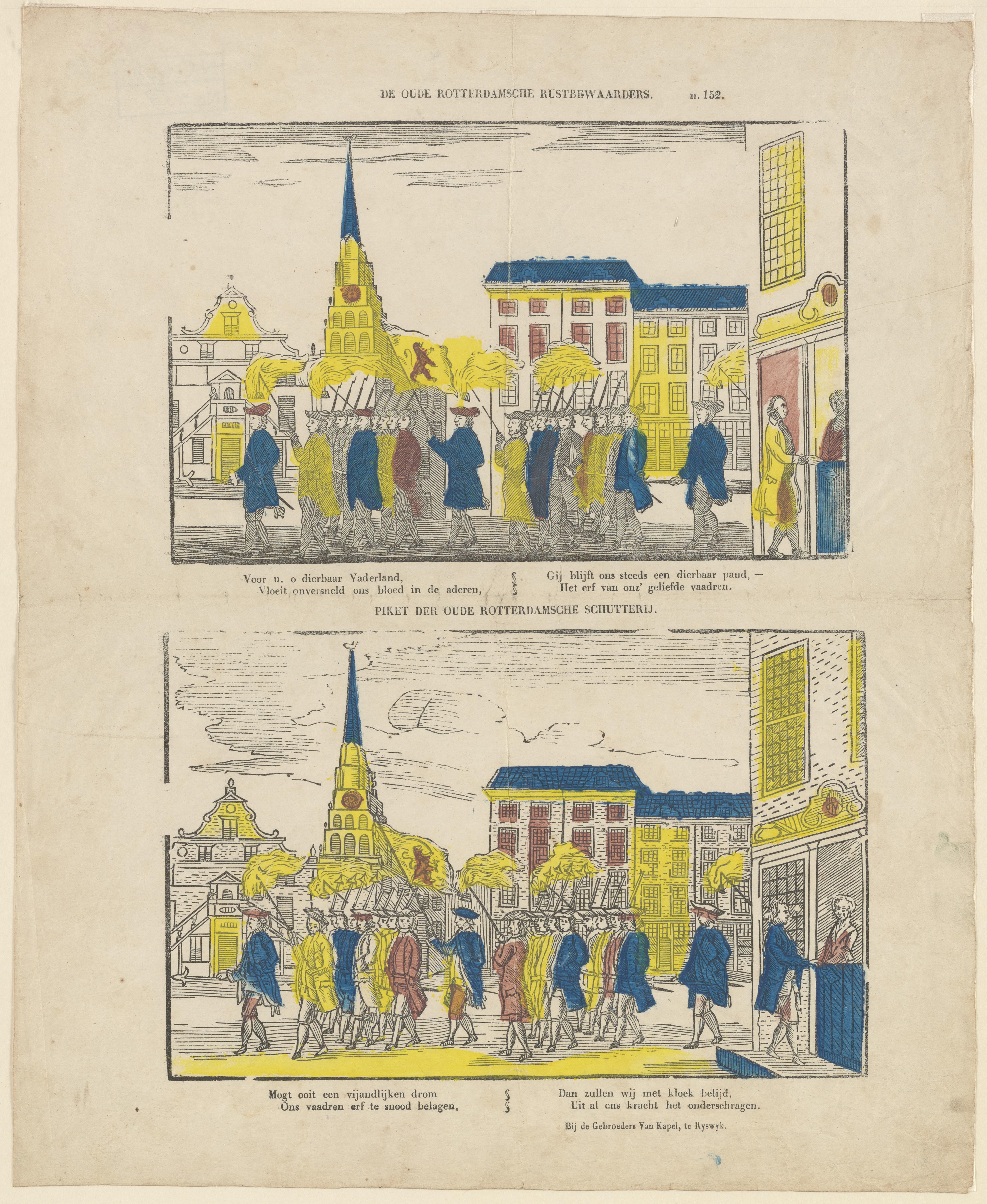 Prent met twee afbeeldingen van de Rotterdamse schutterij. Onder beide afbeeldingen staat een onderschrift. De prent is op de markt gebracht door de wederverkoper Gebroeders van Kapel in Rijswijk en gedrukt door Glenisson & van Genechten of zijn opvolger Glenisson & Zonen in Turnhout. Het drukblok is gegraveerd door Hermanus Lubeek.