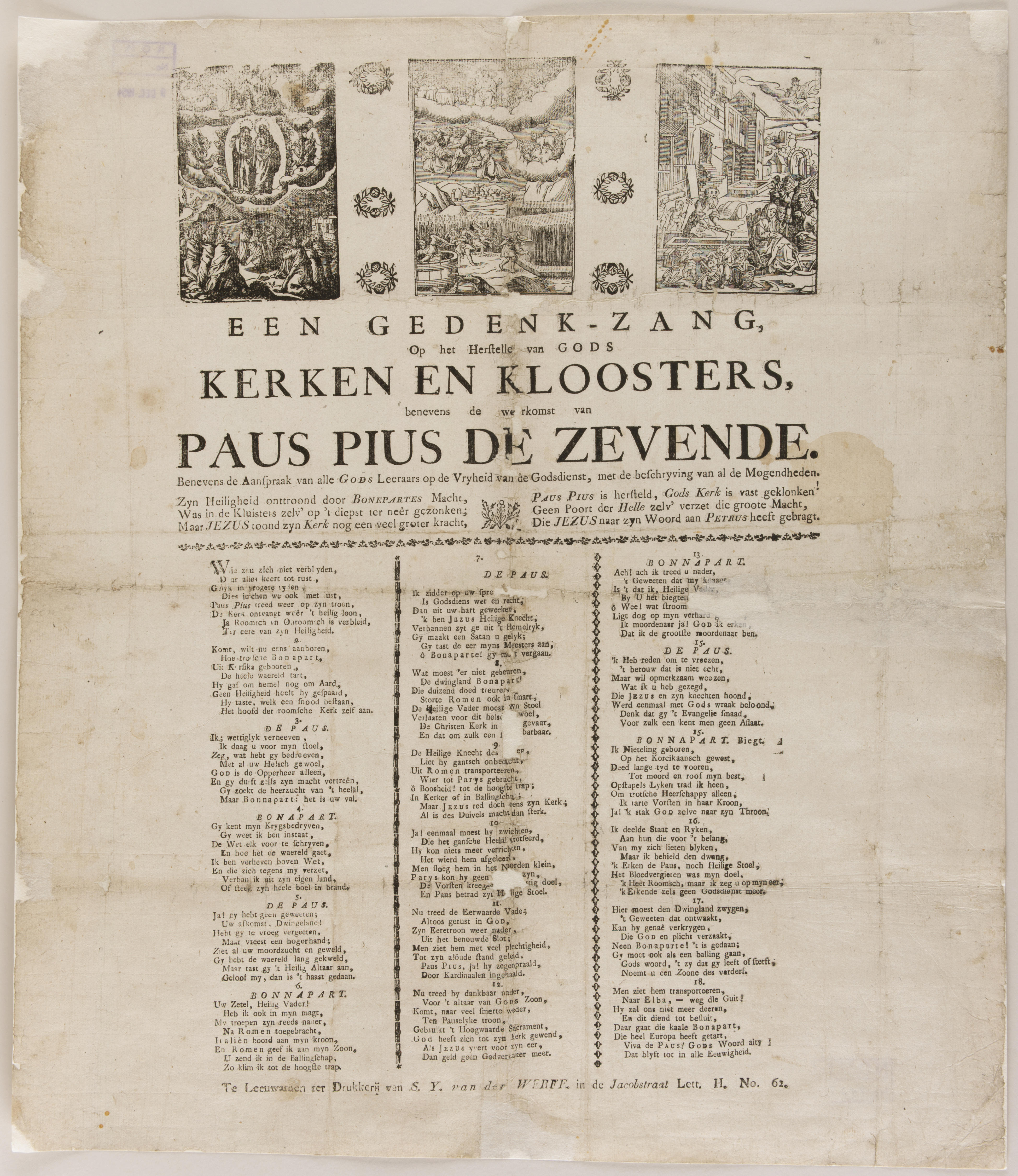 Een gedenk-zang op het herstellen van gods kerken en kloosters benevens de weerkomst van paus Pius de zevende