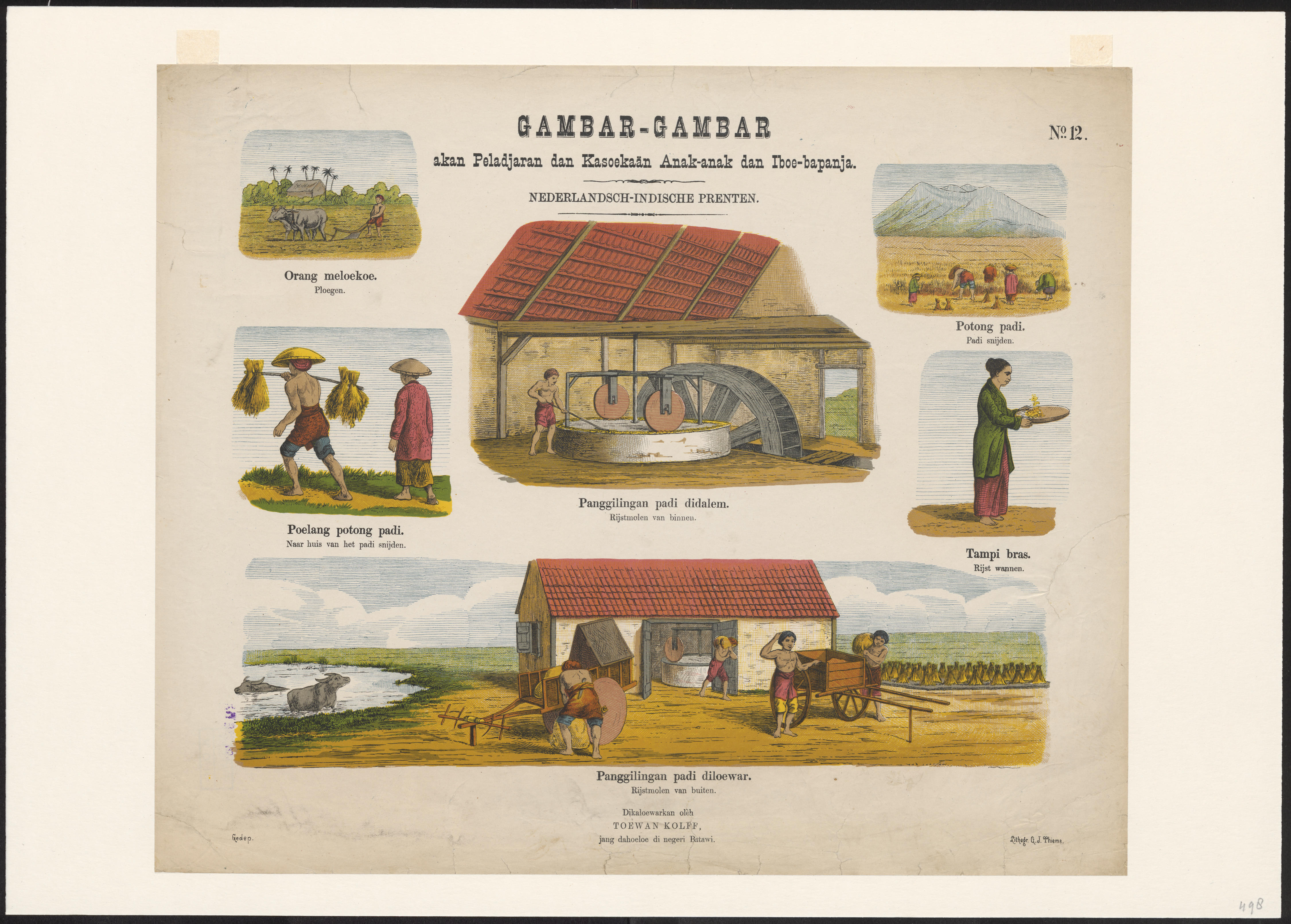 Prent met zes afbeeldingen van het verbouwen van rijst in Nederlands-Indië, gedrukt in lithografie. De onderschriften zijn in het Maleis en het Nederlands. De Leidse uitgever Gualtherus Kolff (1826-1881) gaf in 1879 een serie van 24 prenten uit met de serietitel Gambar-Ggambar. Bij de reeks werd tevens een titelblad gedrukt. De afbeeldingen zijn gemaakt door ...