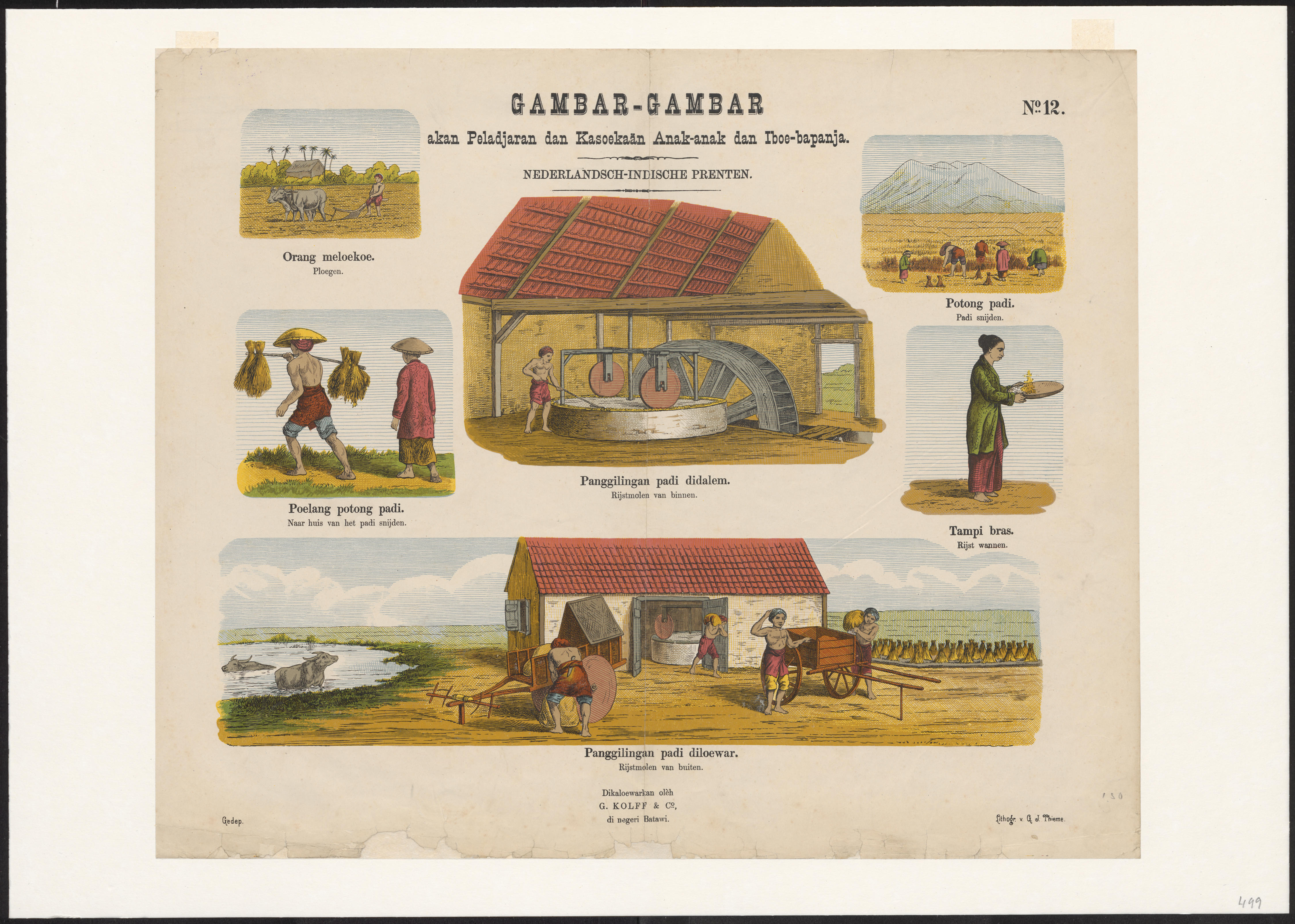 Prent met zes afbeeldingen van het verbouwen van rijst in Nederlands-Indië, gedrukt in lithografie. De onderschriften zijn in het Maleis en het Nederlands. De Leidse uitgever Gualtherus Kolff (1826-1881) gaf in 1879 een serie van 24 prenten uit met de serietitel Gambar-Gambar. Bij de reeks werd tevens een titelblad gedrukt. De afbeeldingen zijn gemaakt door ...