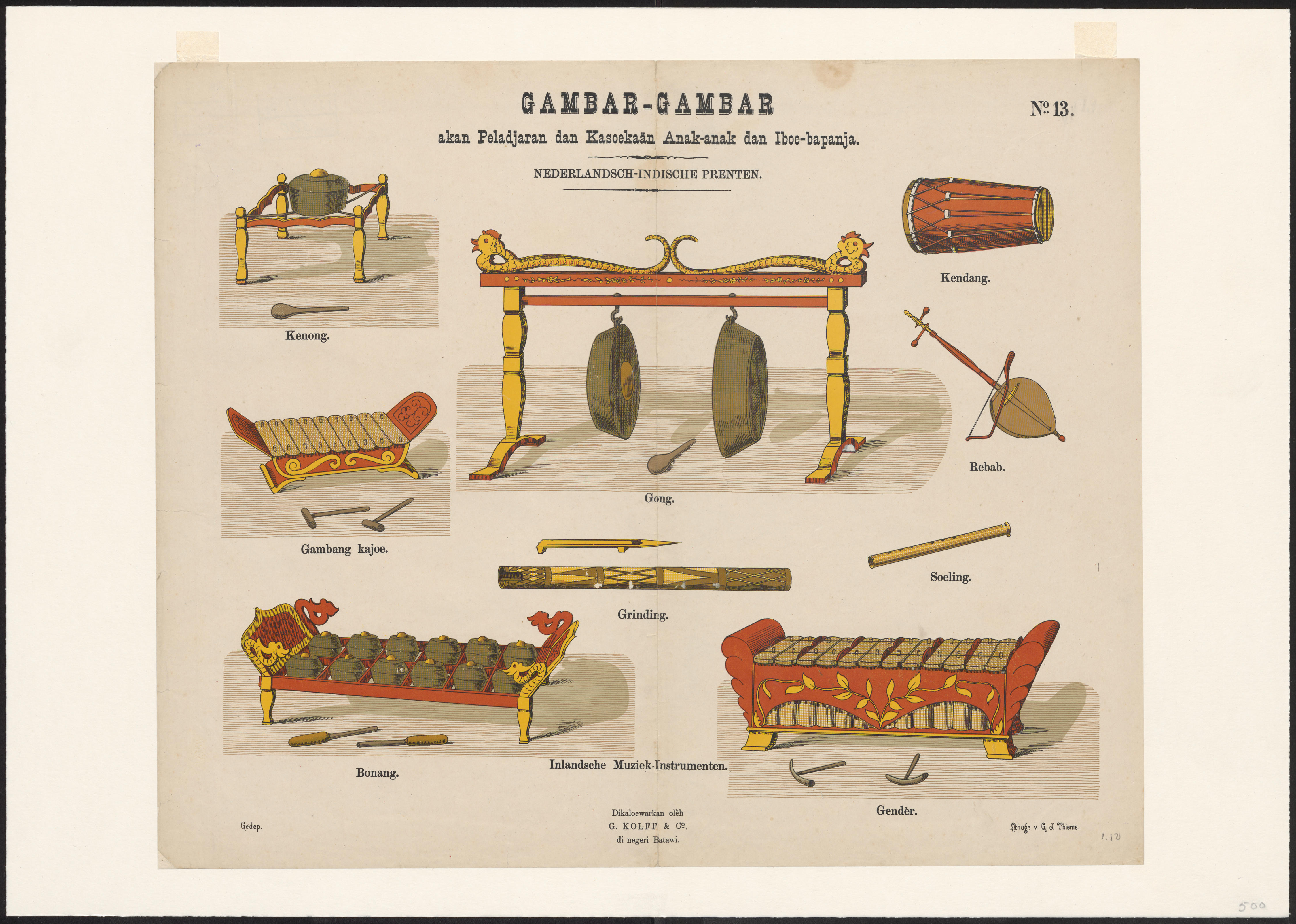 Prent met negen afbeeldingen van muziekinstrumenten in Nederlands-Indië, gedrukt in lithografie. De onderschriften zijn in het Maleis en het Nederlands. De Leidse uitgever Gualtherus Kolff (1826-1881) gaf in 1879 een serie van 24 prenten uit met de serietitel Gambar-Gambar. Bij de reeks werd tevens een titelblad gedrukt. De afbeeldingen zijn gemaakt door de Leidse tekenaar ...