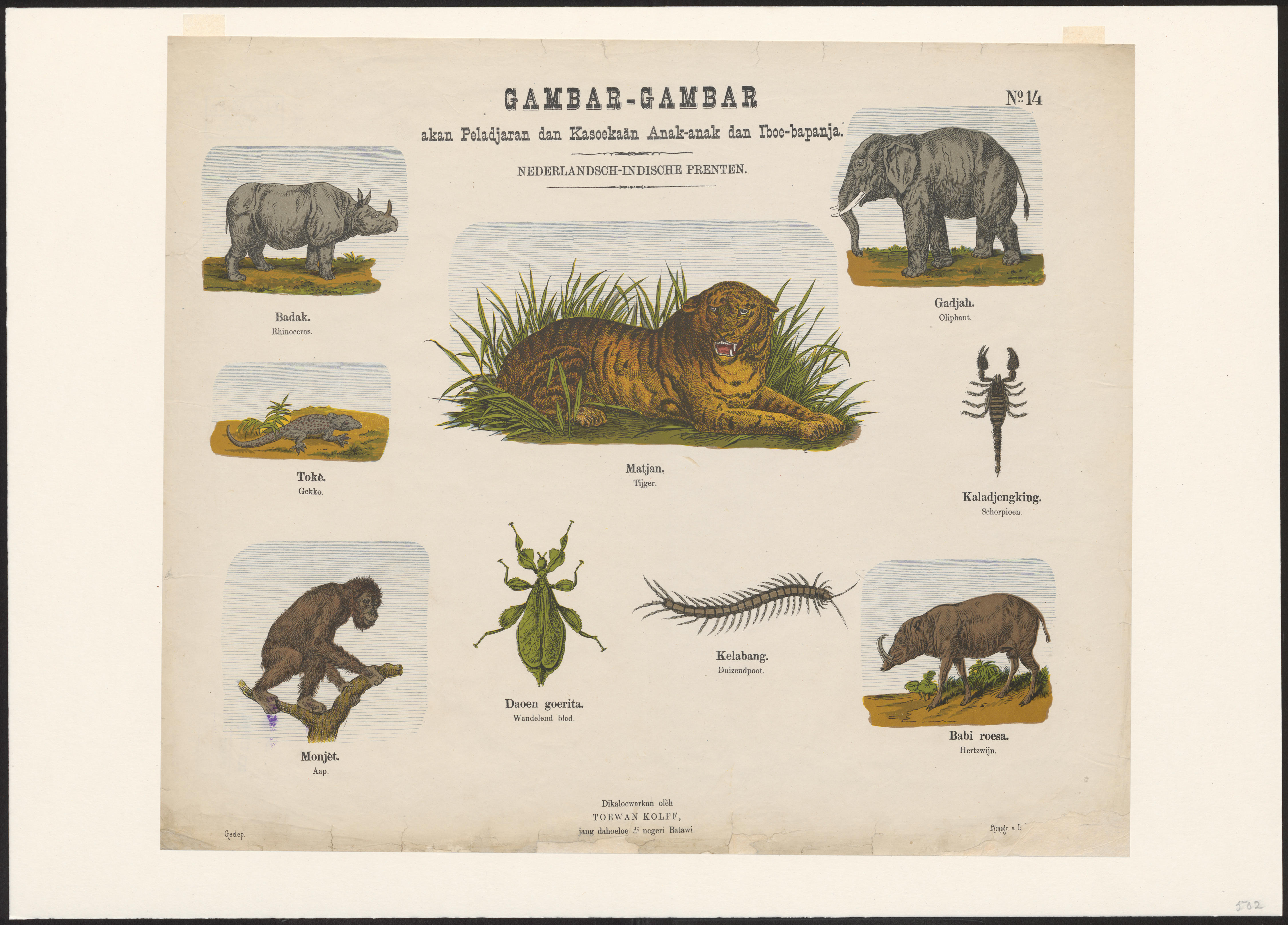 Prent met negen afbeeldingen van dieren in Nederlands-Indië, gedrukt in lithografie. De onderschriften zijn in het Maleis en het Nederlands. De Leidse uitgever Gualtherus Kolff (1826-1881) gaf in 1879 een serie van 24 prenten uit met de serietitel Gambar-Gambar. Bij de reeks werd tevens een titelblad gedrukt. De afbeeldingen zijn gemaakt door de Leidse tekenaar ...