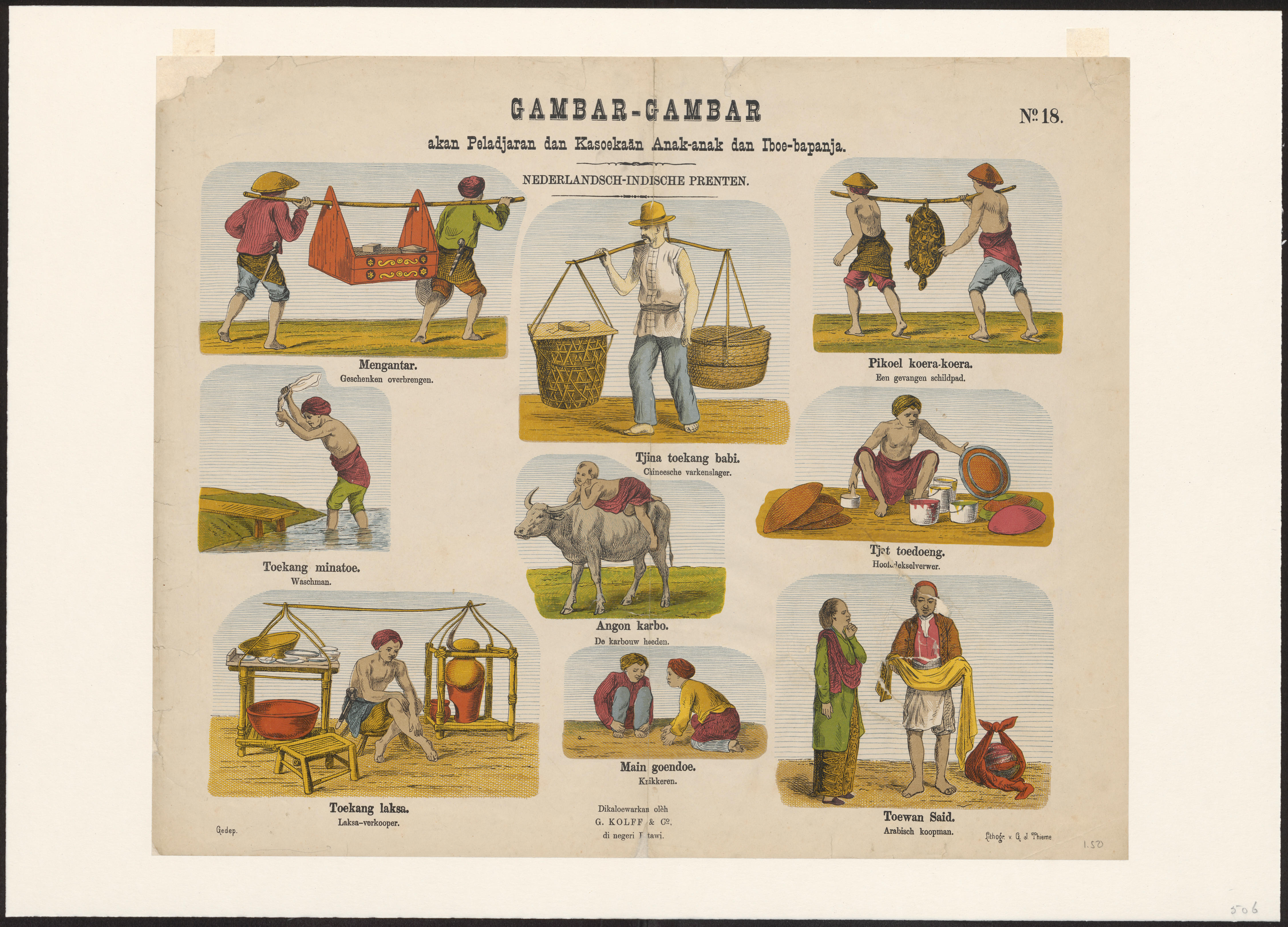 Prent met negen afbeeldingen van handelsactiviteiten in Nederlands-Indië, gedrukt in lithografie. De onderschriften zijn in het Maleis en het Nederlands. De Leidse uitgever Gualtherus Kolff (1826-1881) gaf in 1879 een serie van 24 prenten uit met de serietitel Gambar-Gambar. Bij de reeks werd tevens een titelblad gedrukt. De afbeeldingen zijn gemaakt door de Leidse tekenaar ...