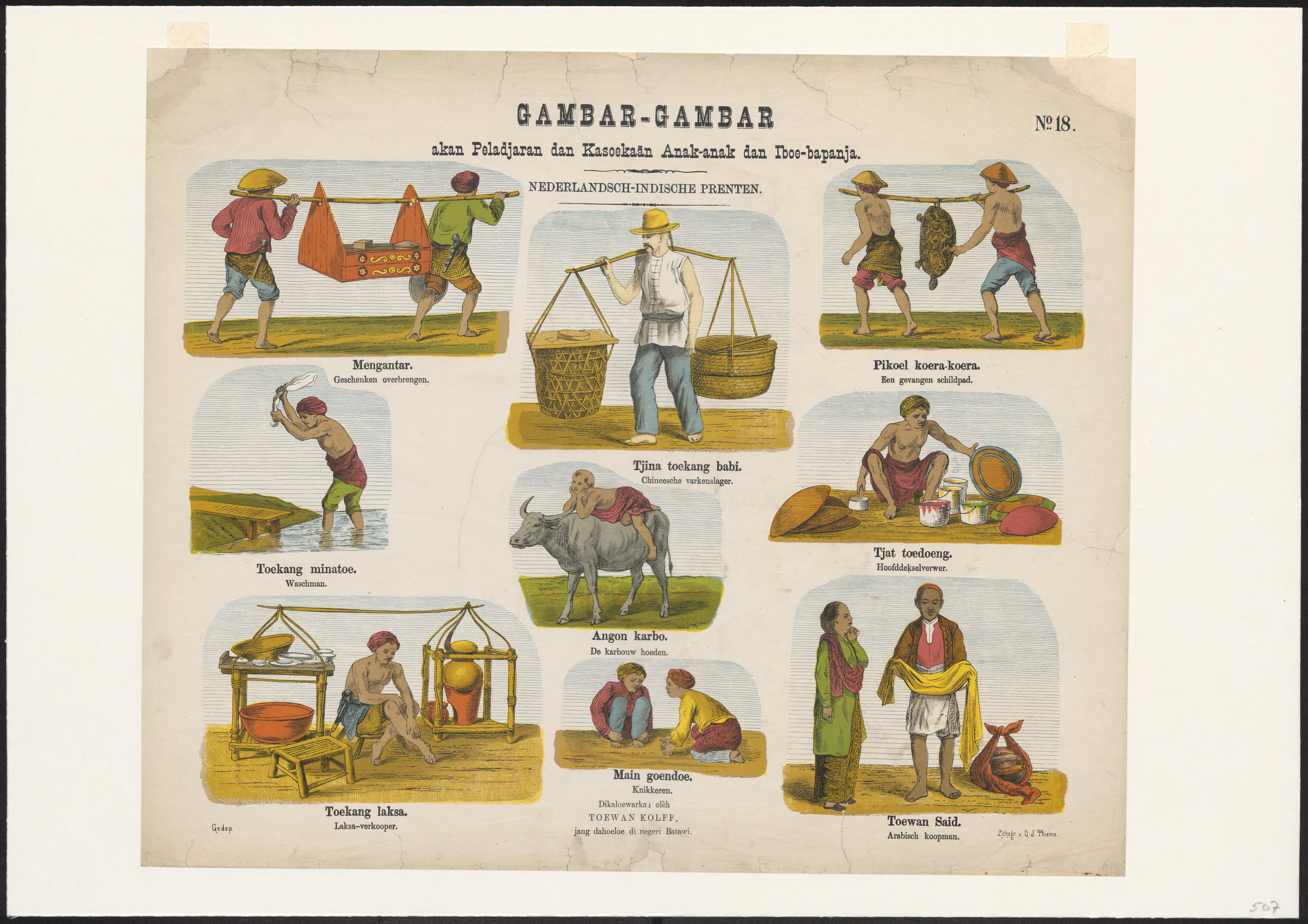 Prent met negen afbeeldingen van handelsactiviteiten in Nederlands-Indië, gedrukt in lithografie. De onderschriften zijn in het Maleis en het Nederlands. De Leidse uitgever Gualtherus Kolff (1826-1881) gaf in 1879 een serie van 24 prenten uit met de serietitel Gambar-Gambar. Bij de reeks werd tevens een titelblad gedrukt. De afbeeldingen zijn gemaakt door de Leidse tekenaar ...