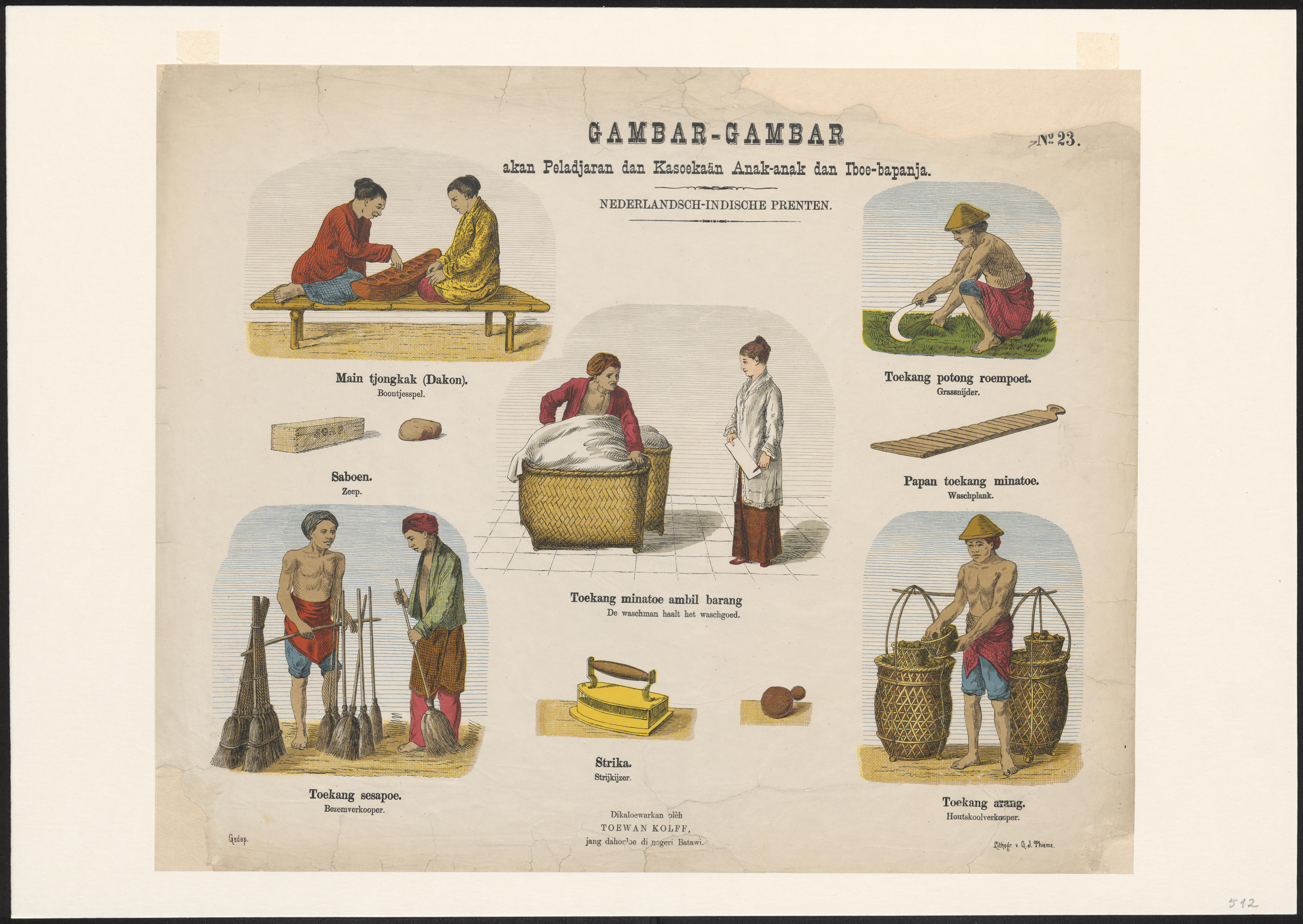 Prent met negen afbeeldingen van bezigheden en voorwerpen in Nederlands-Indië, waaronder het boontjesspel, een bezemverkoper, de was, gras snijden en een houtskoolverkoper. De prent is gedrukt in lithografie. De onderschriften zijn in het Maleis en het Nederlands. De Leidse uitgever Gualtherus Kolff (1826-1881) gaf in 1879 een serie van 24 prenten uit met de serietitel ...