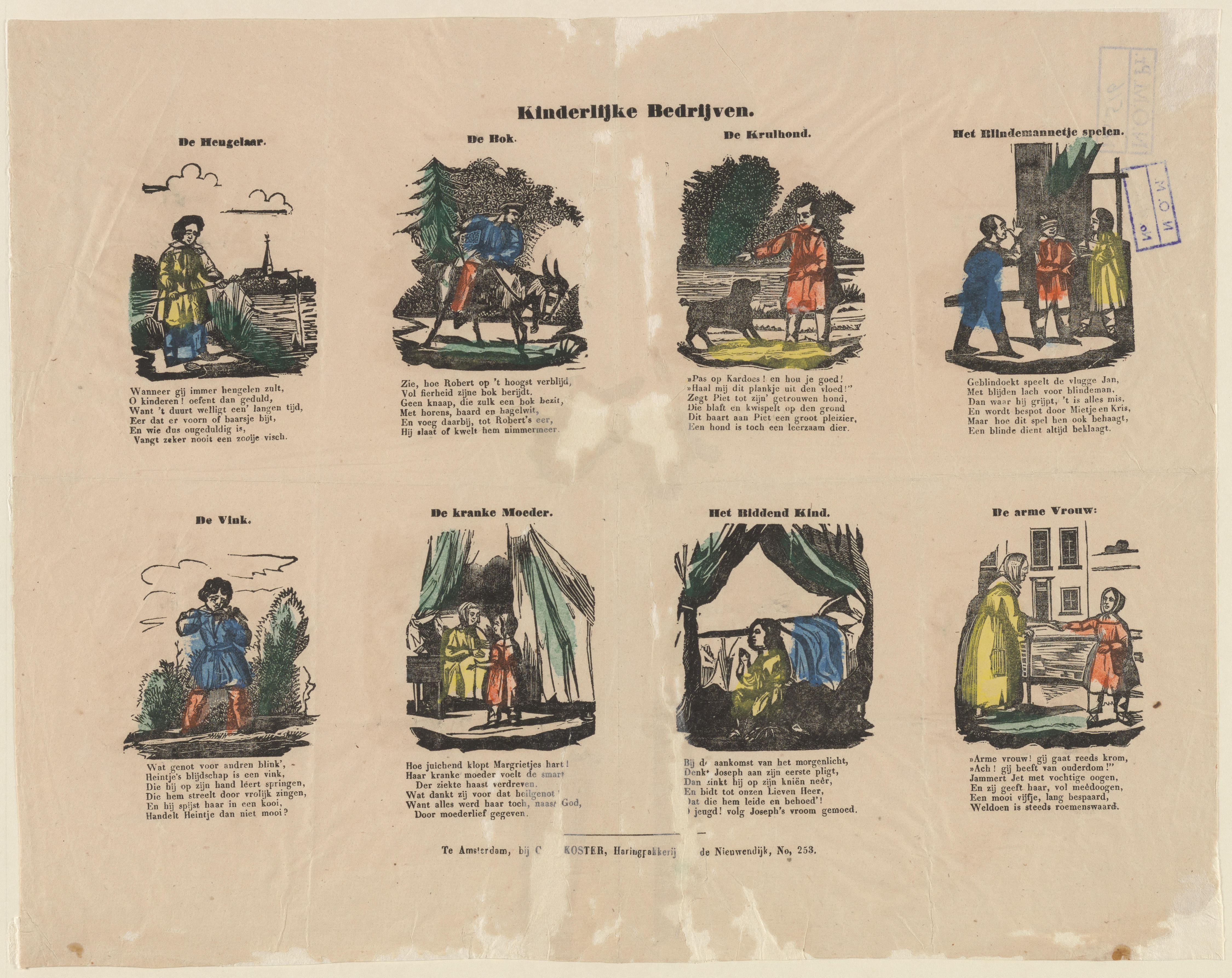 Prent met acht afbeeldingen van kinderspelen, gedrukt met afzonderlijke houtsneden en ingekleurd met rood, geel, groen en blauw. De teksten zijn gedrukt in boekdruk. In afbeelding acht staat de signatuur van graveur Fuchs. De prent heeft geen fondsnummer.