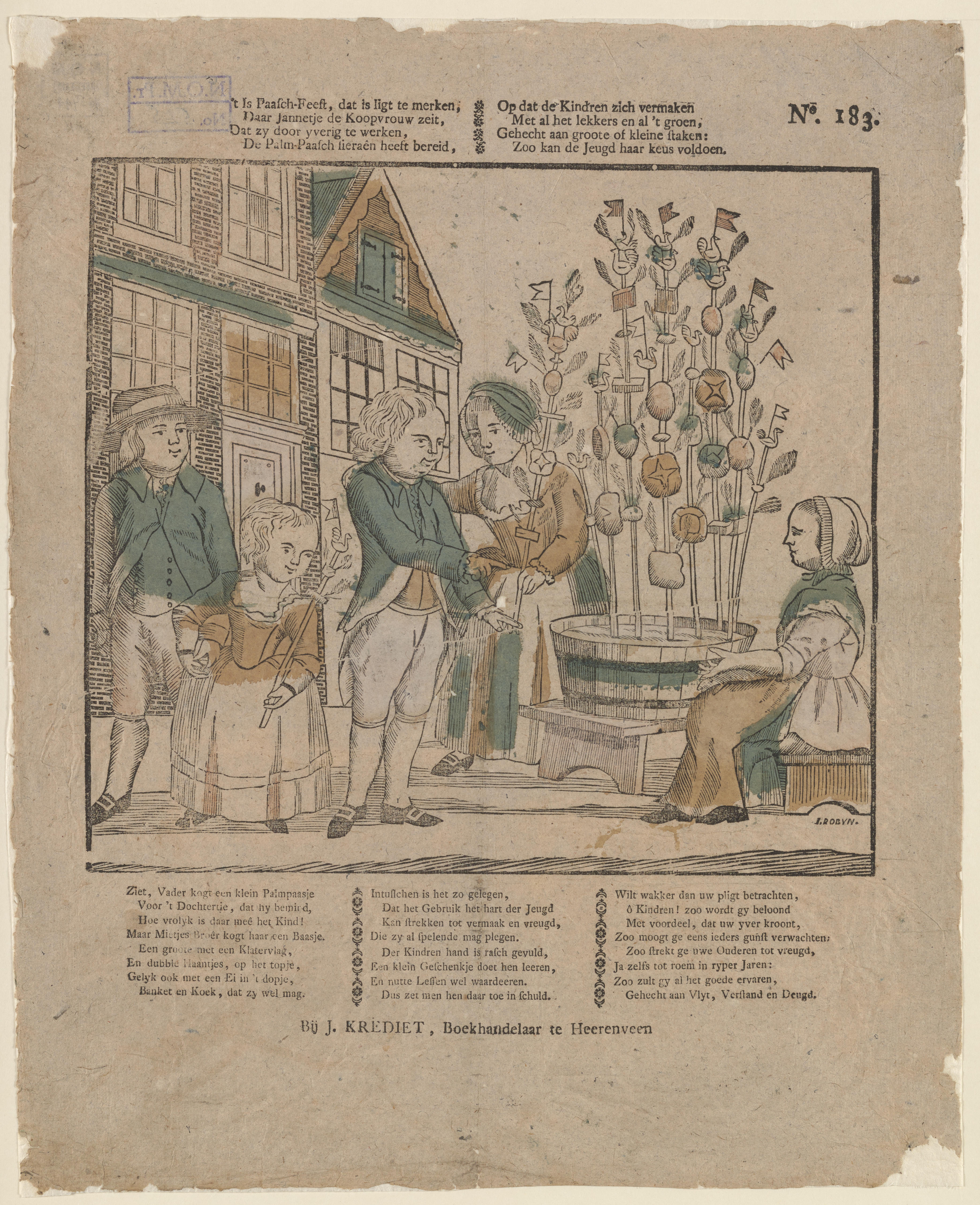 't Is Paasch-Feest, dat is ligt te merken, / Daar Jannetje de Koopvrouw zeit, / Dat zy door yvrerig te werken, / De Palm-Paasch sieraên heeft bereid, // Op dat de Kindren zich vermaken / Met al het lekkers en al 't groen, / Gehecht aan groote of kleine staken: / Zoo kan de Jeugd ...