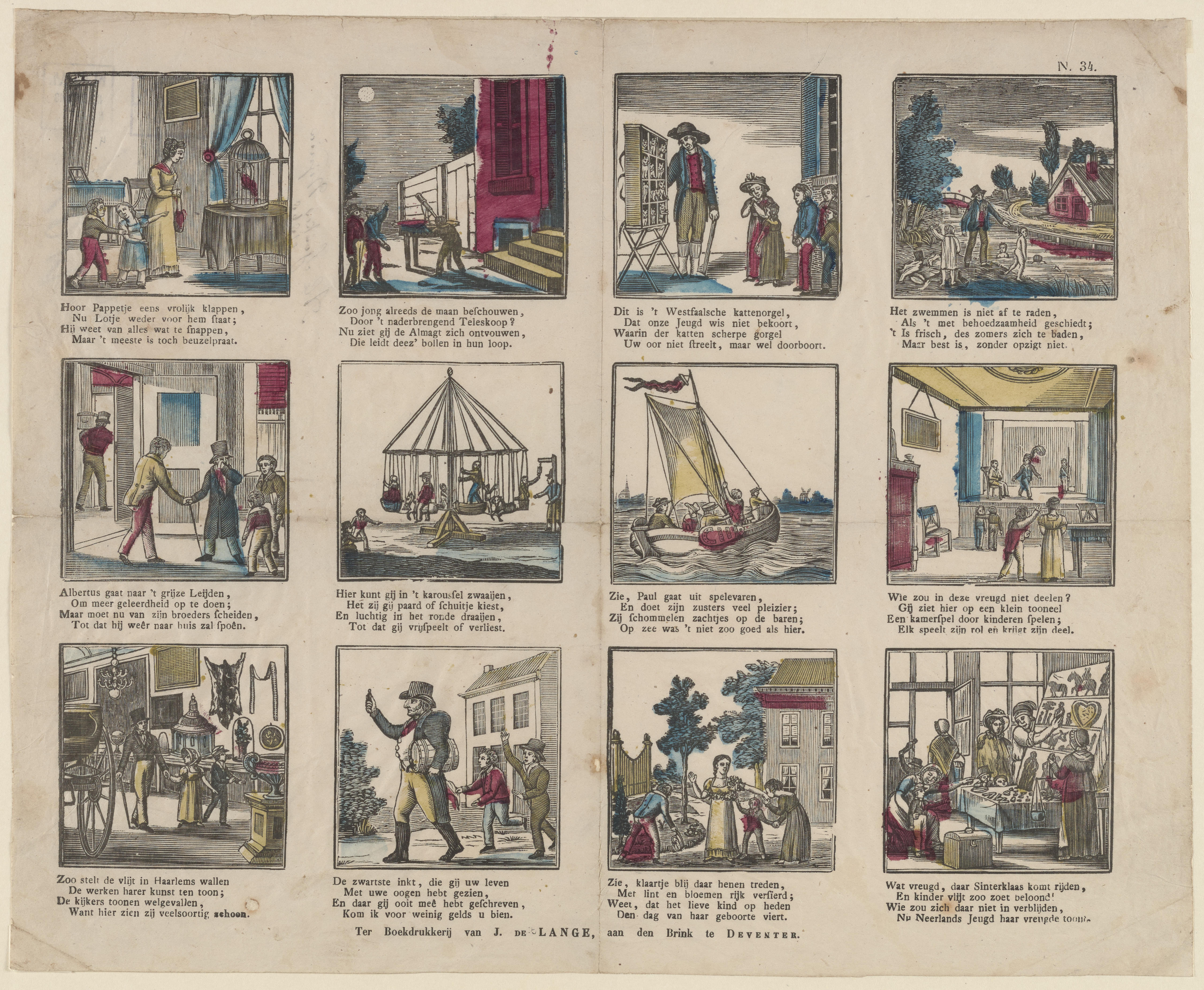 Prent met twaalf voorstellingen van onder meer huiselijke bezigheden en kermisvermakelijkheden, gedrukt met afzonderlijke houtsneden en ingekleurd met geel, rood en blauw. Onder iedere afbeelding staat een vierregelig onderschrift. De prent heeft geen titel. Rechtsboven staat het fondsnummer 34.
