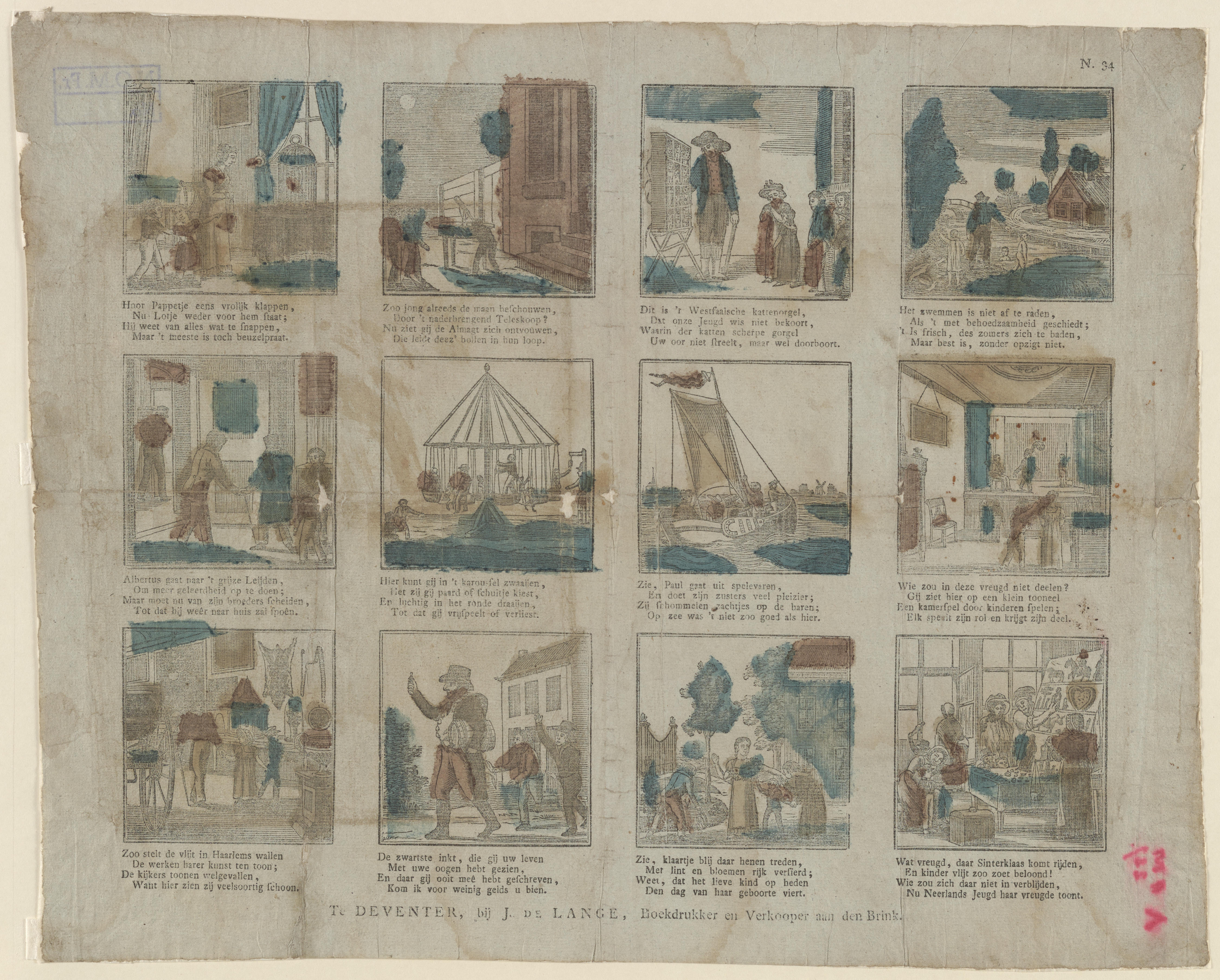 Prent met twaalf voorstellingen van onder meer huiselijke bezigheden en kermisvermakelijkheden, gedrukt met afzonderlijke houtsneden en ingekleurd met geel, rood en blauw. Onder iedere afbeelding staat een vierregelig onderschrift. De prent heeft geen titel. Rechtsboven staat het fondsnummer 34.