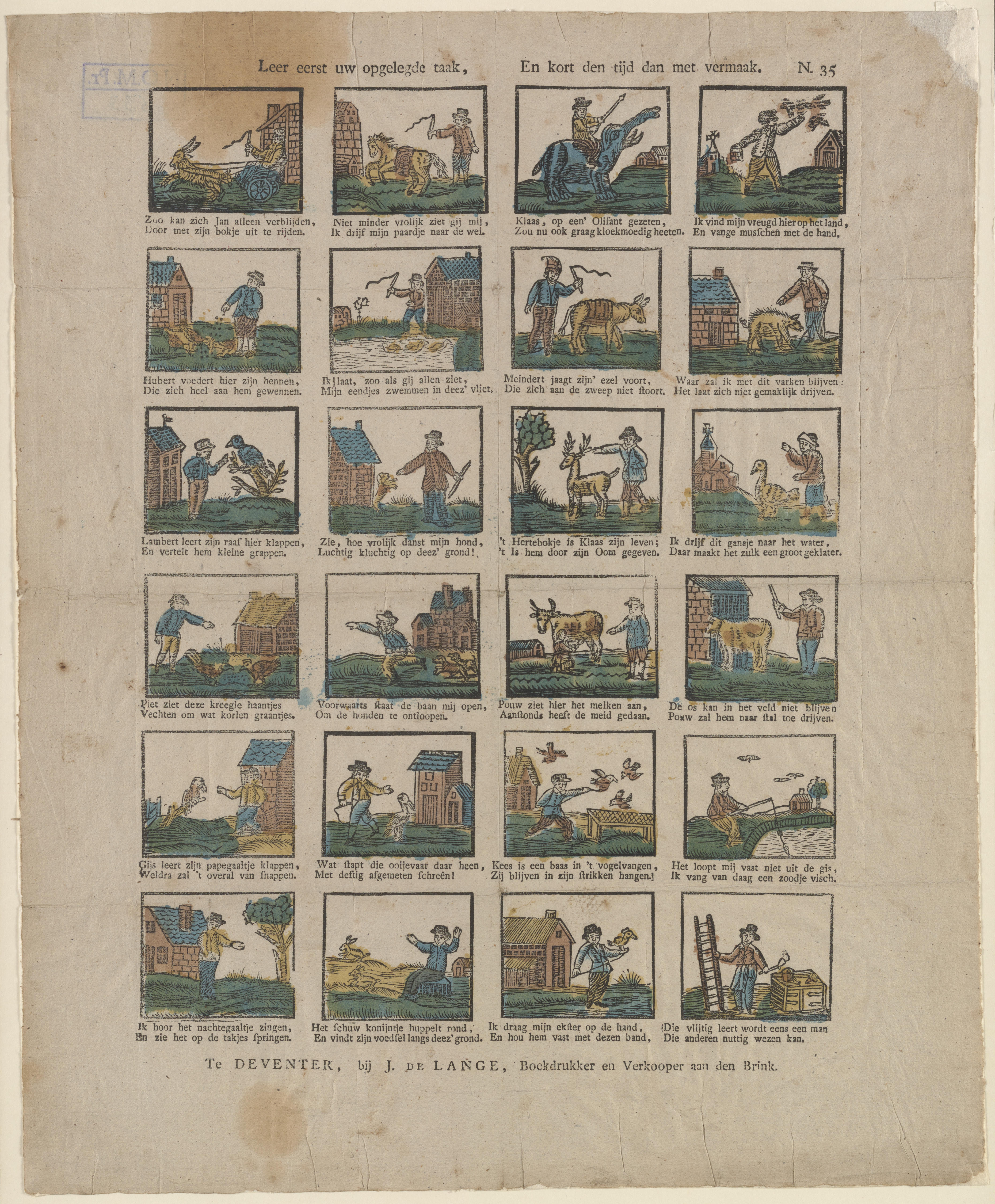 Prent met 24 voorstellingen van kinderen met dieren, gedrukt met afzonderlijke houtsneden en ingekleurd met geel, rood en blauw. Onder iedere afbeelding staat een tweeregelig onderschrift. De prent heeft rechtsboven het fondsnummer 35.