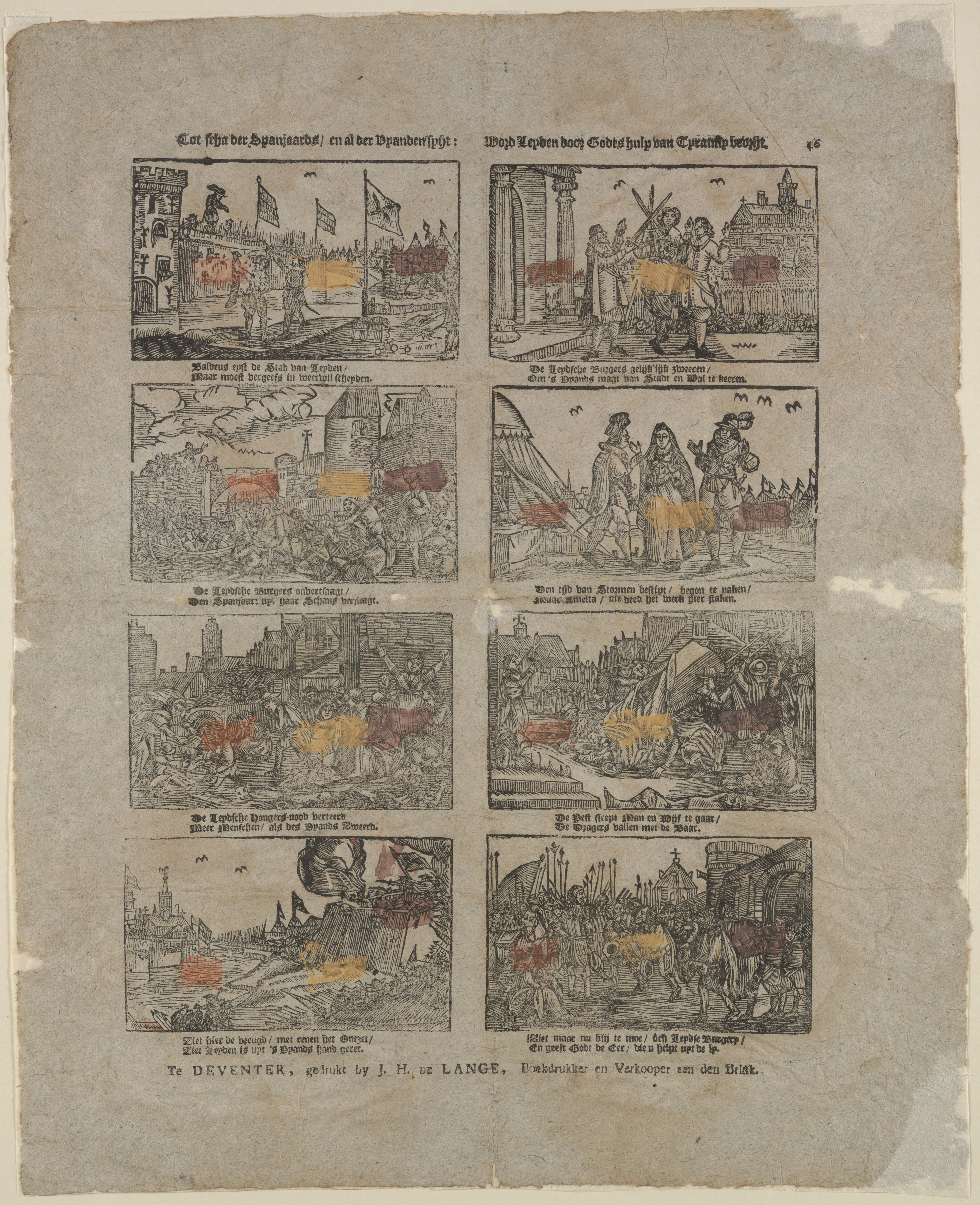 Prent met acht voorstellingen van het ontzet van Leiden op 3 oktober 1574, gedrukt met afzonderlijke houtsneden en ingekleurd met geel en rood. Onder iedere afbeelding staat een tweeregelig onderschrift. De prent heeft rechtsboven het fondsnummer 46.