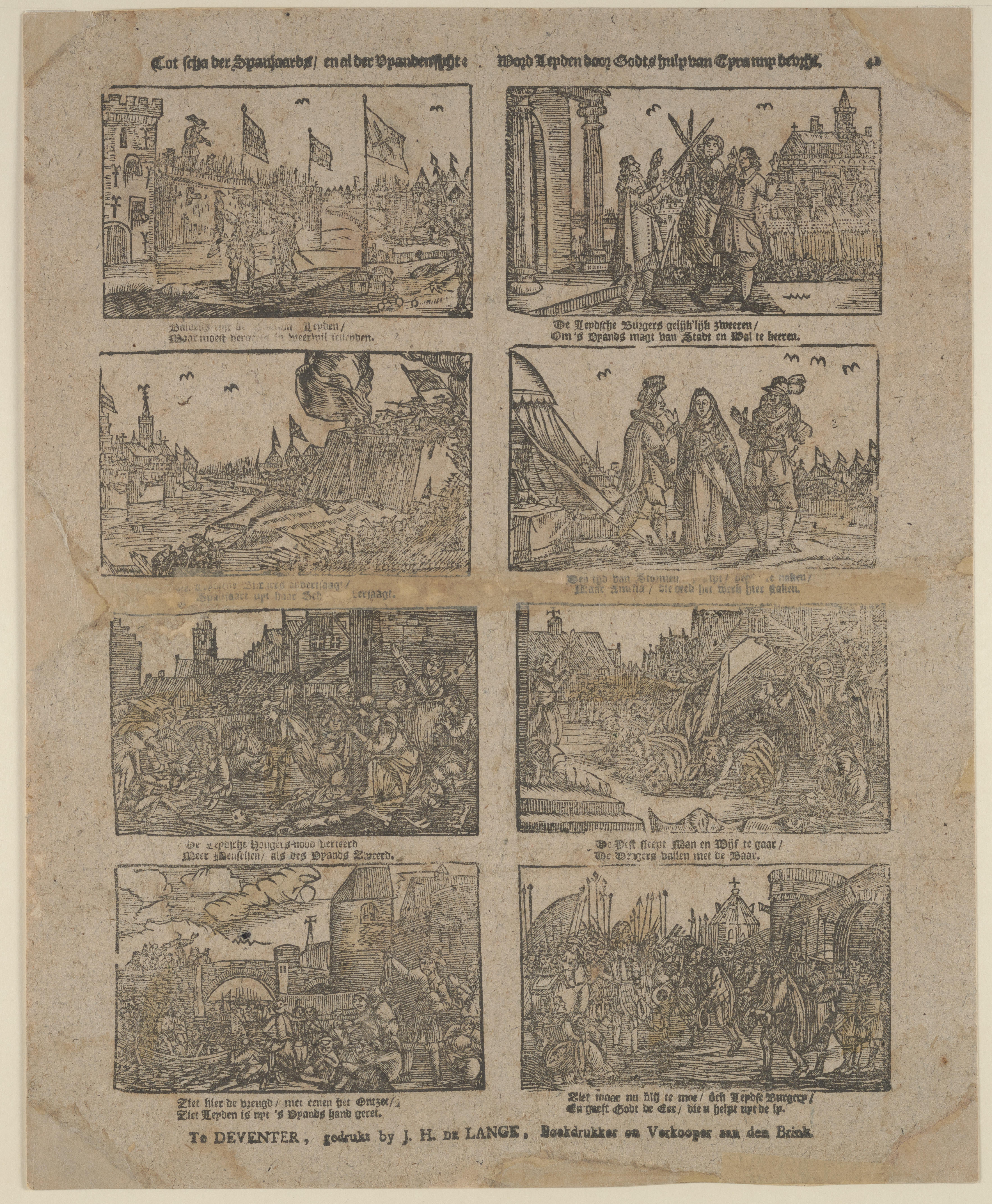 Prent met acht voorstellingen van het ontzet van Leiden op 3 oktober 1574, gedrukt met afzonderlijke houtsneden en ingekleurd met geel. Onder iedere afbeelding staat een tweeregelig onderschrift. De prent heeft rechtsboven het fondsnummer 46.