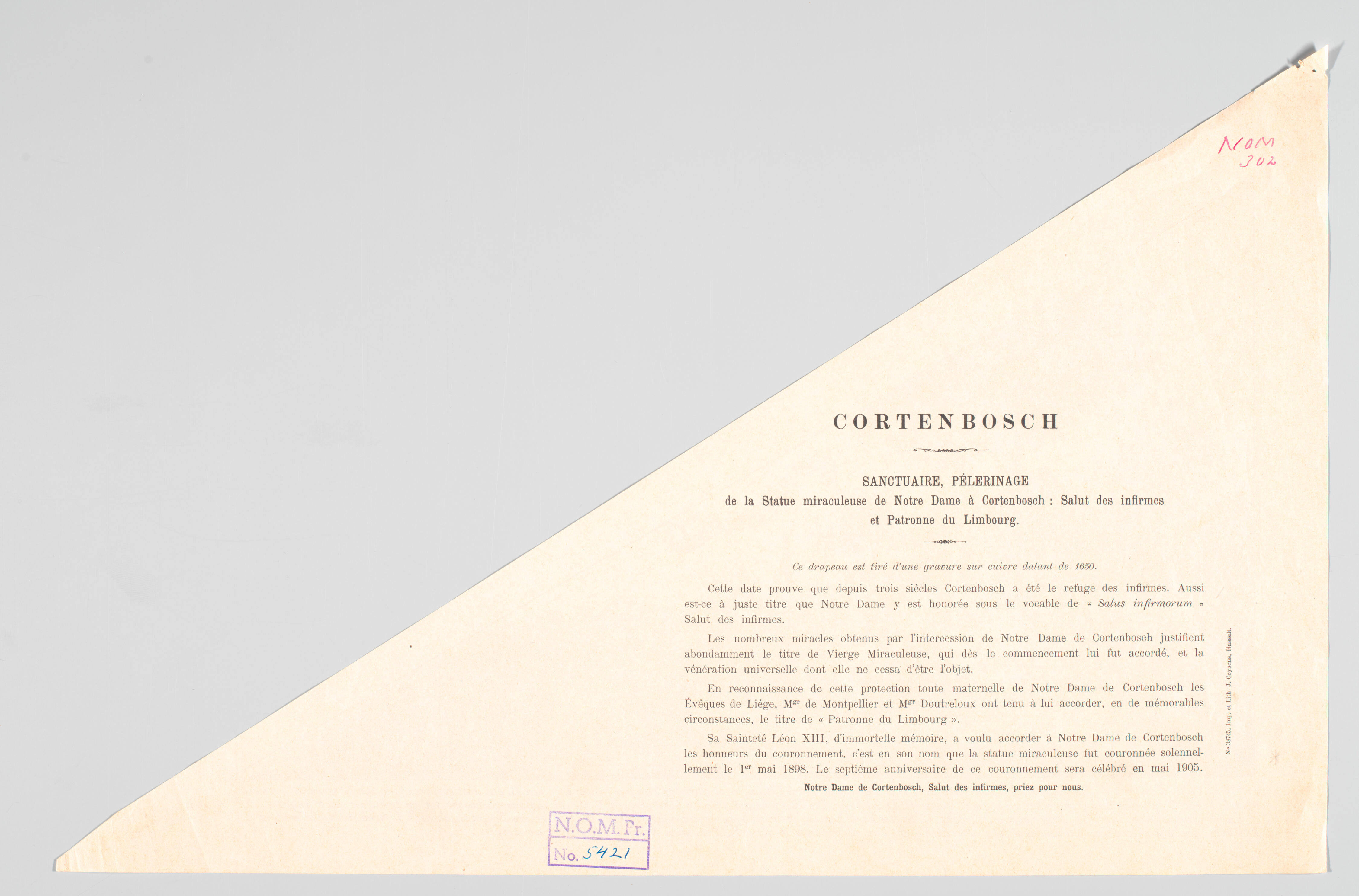 Driehoekig bedevaartvaantje van papier uit Kortenbosch met een houten kapel bij een eikenboom met een devotiebeeld van Maria met kindje Jezus. Rechts voor de kapel knielen twee geestelijken. Links loopt een stoet mannen en vrouwen, met voorop een priester die met zijn linkerhand naar de kapel gebaart. Links op de voorgrond is een pelgrim verbeeld ...