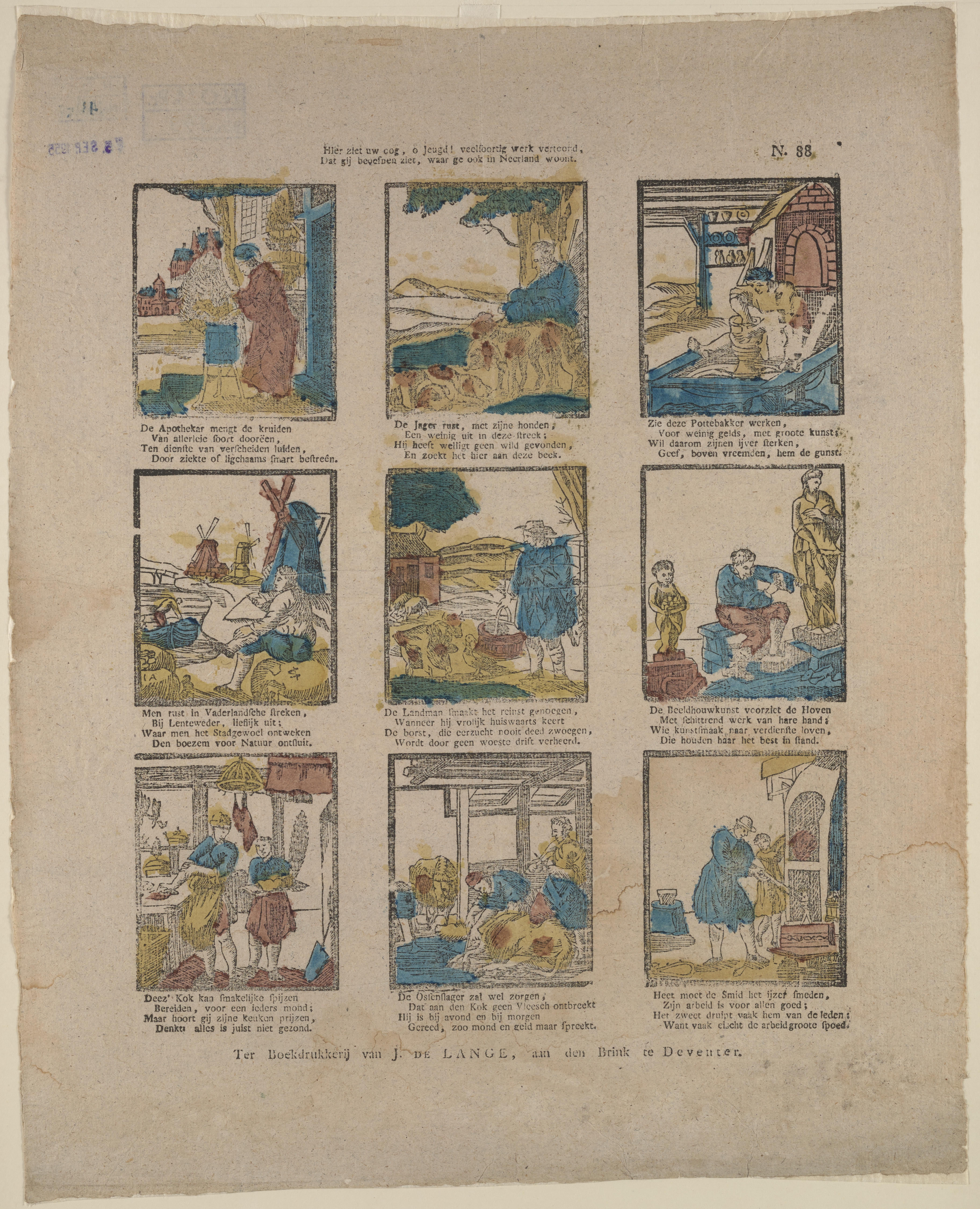 Prent met negen afbeeldingen van ambachten en bezigheden, gedrukt met afzonderlijke houtsneden en ingekleurd met blauw, rood en geel. Onder iedere afbeelding staat een vierregelig onderschrift. In afbeelding 4 staat de signatuur I.A. De prent heeft geen titel. Rechtsboven staat het fondsnummer 88.