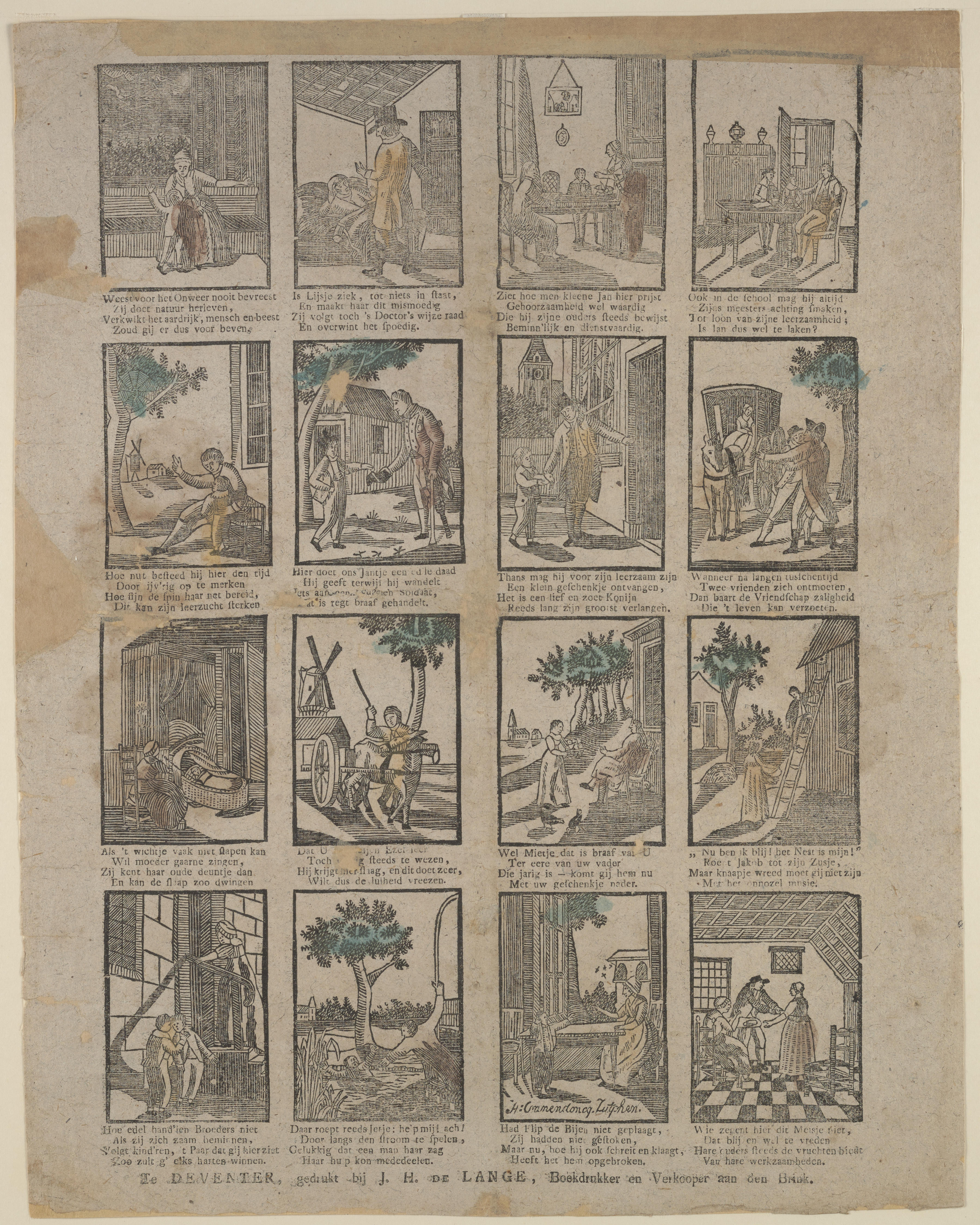 Prent met zestien afbeeldingen van kinderspelen en kinderbezigheden, gedrukt met afzonderlijke houtsneden en ingekleurd met groen, geel en rood. Onder iedere afbeelding staat een vierregelig onderschrift. In afbeelding 15 staat de signatuur van graveur Alexander C. Cranendoncq, de vervaardiger van de drukblokken. De prent heeft geen titel en geen fondsnummer. Hij komt ook voor met ...