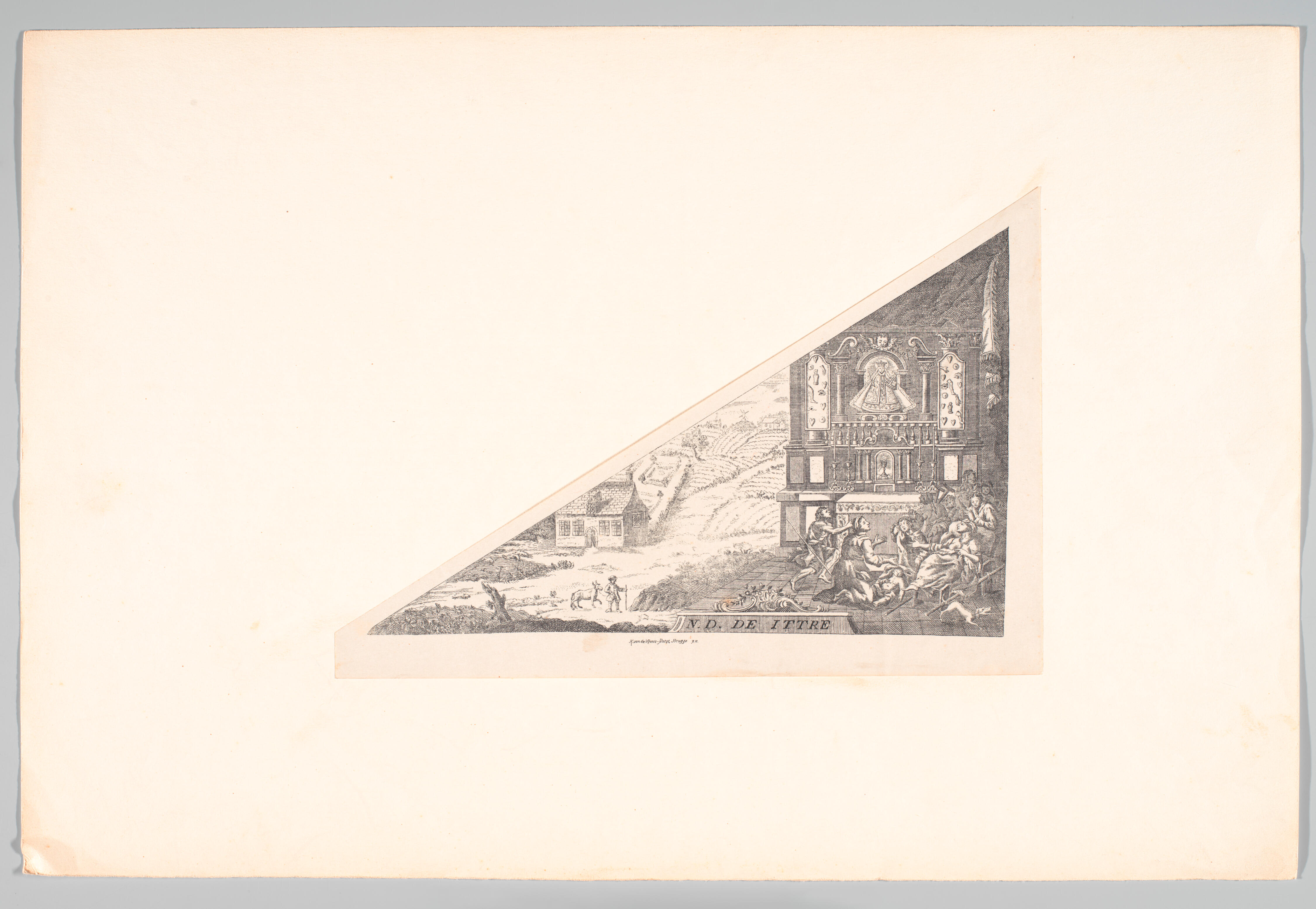 Driehoekig bedevaartvaantje van papier uit Itter met rechts een interieur van een kerkgebouw met een altaar waarop een Mariabeeld staat met het kind Jezus op de linkerarm en een scepter in de rechterhand, met aan weerszijden een tableau met ex voto's in de vorm van een hart, been, hand, borst, oog en ingebakerd kind. Onder ...