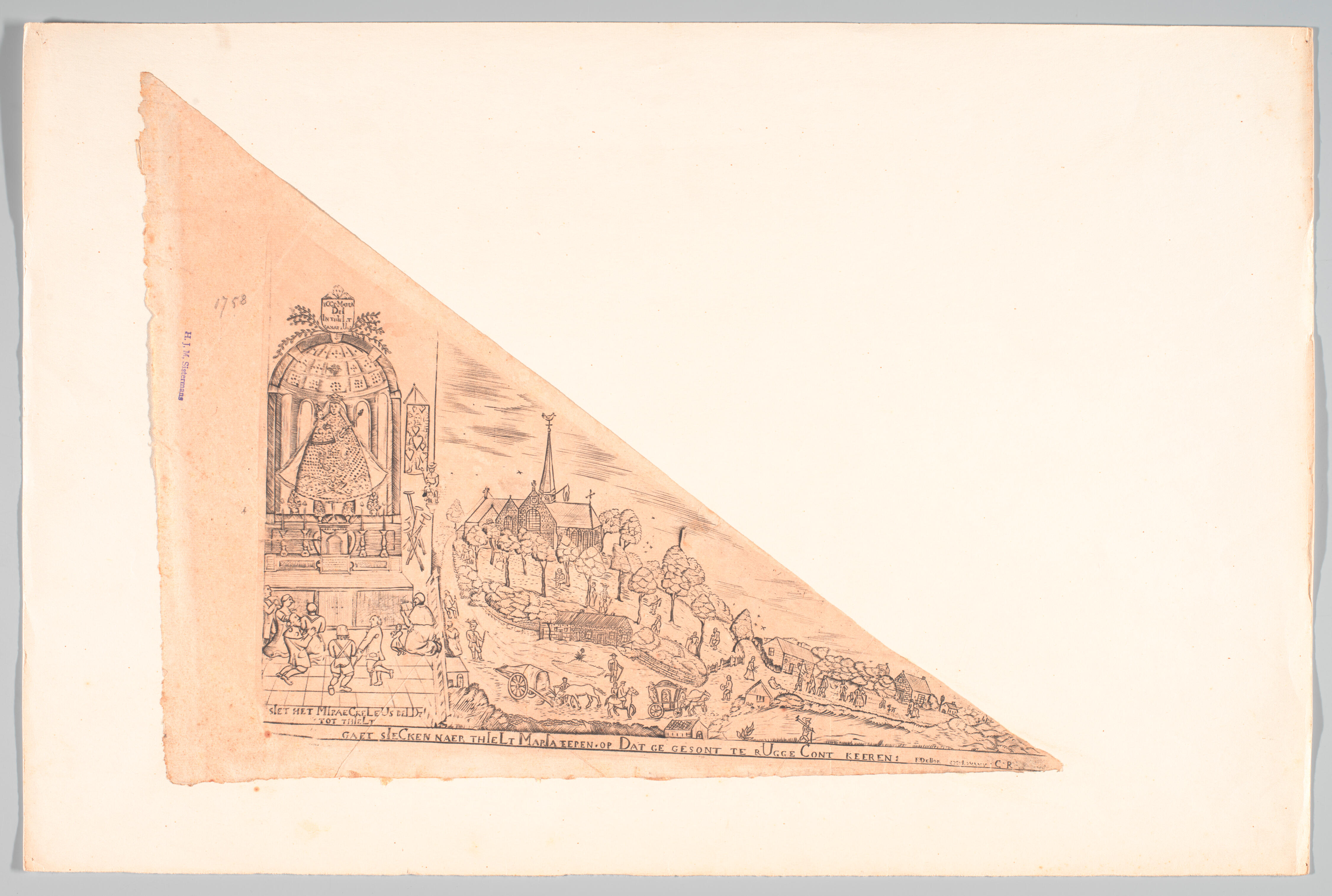 Driehoekig bedevaartvaantje op papier van Onze Lieve Vrouw-Tielt met links een altaar met een devotiebeeld van Maria met kind op de rechterarm en een staf in de linkerhand. In een schild hierboven staat de tekst: 'Ecce Mater / DeI / In thIeLt / sanat sUos' (Zie de Moeder Gods in Thielt, geneest hen). Voor het ...