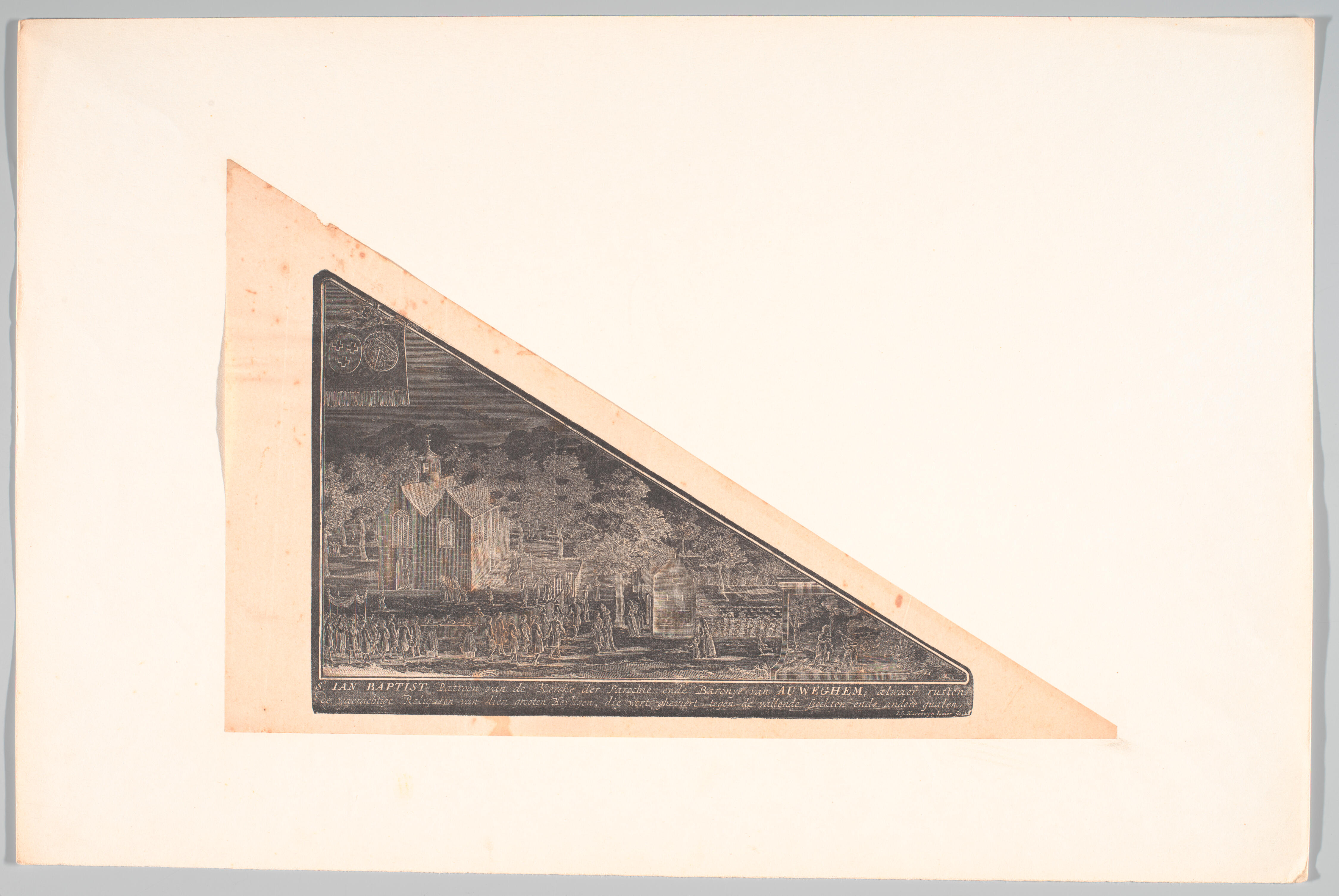 Driehoekig bedevaartvaantje van papier uit Ouwegem in de techniek mezzotint of zwarte kunst, met links een kapel. Op de voorgrond is een processie te zien, met links een baldakijn met daaronder een priester met een monstrans, rechts daarvan vier mannen die een draagbaar dragen met daarop een beeld van een schotel met daarop het hoofd ...