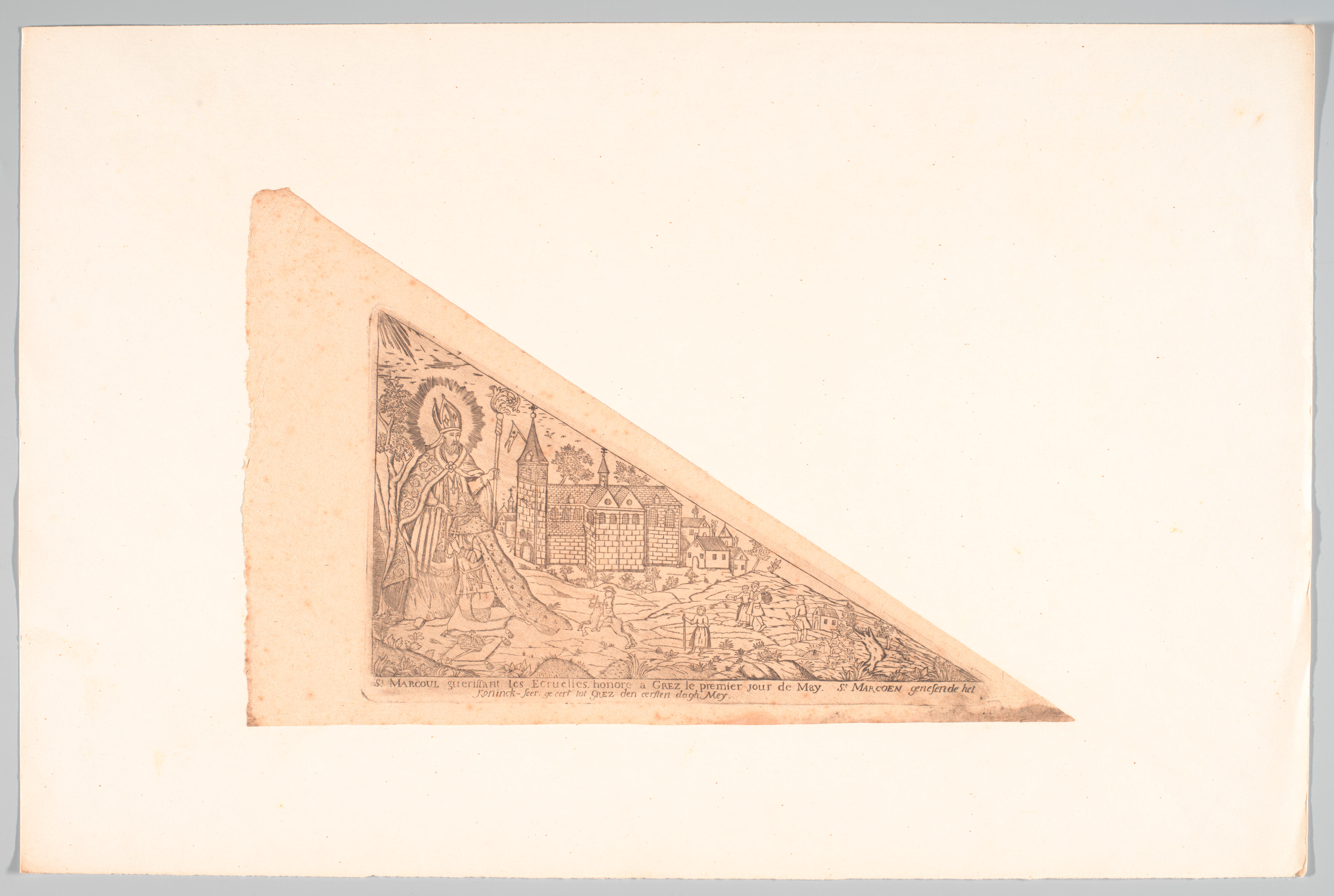 Driehoekig bedevaartvaantje op papier van de bedevaartsplaats Graven met links de heilige abt Markoen, gekleed als bisschop, en rond zijn hoofd een stralenkrans (aureool). Voor hem knielt een vorstelijk uitziende man met een hermelijnen mantel. De koning heeft zijn handen gevouwen voor de borst en kust een rond voorwerp in de hand van de heilige. ...