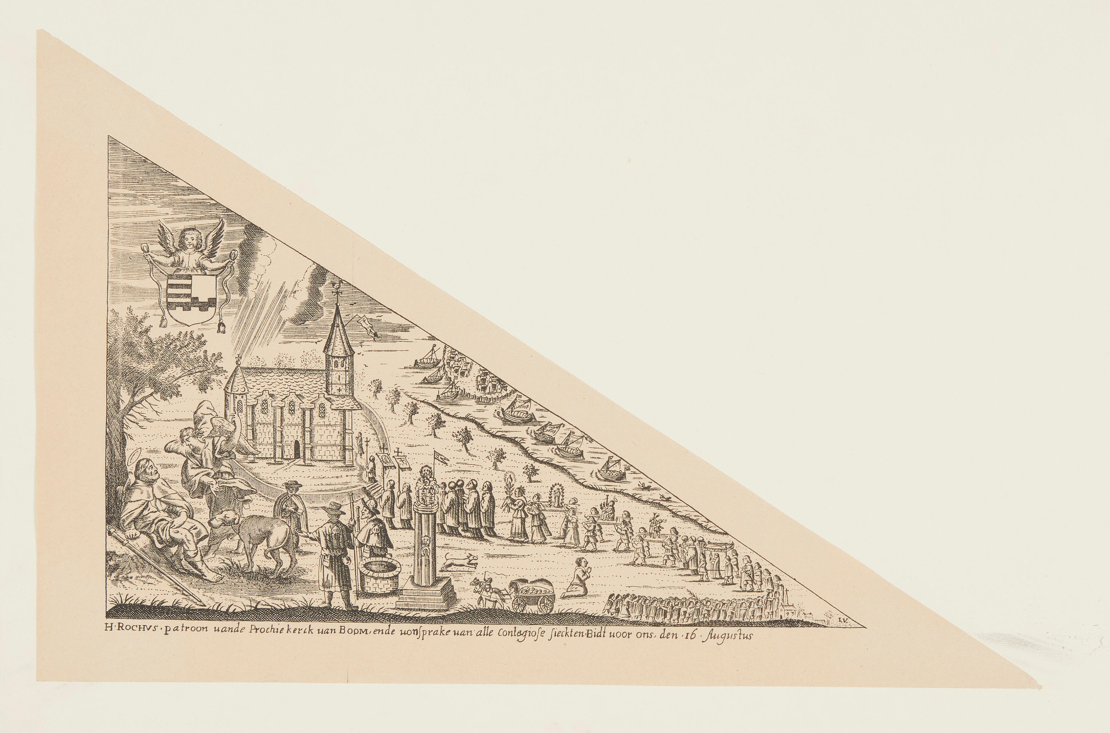Driehoekig bedevaartvaantje van papier uit Boom, met links een boom met daaronder de heilige Rochus met een engel en een hond die een homp brood in zijn bek houdt, verwijzend naar een legende over de heilige Rochus. Boven het hoofd van Rochus is een cirkelvormige nimbus te zien, een teken van zijn heiligheid. Naast hem ...