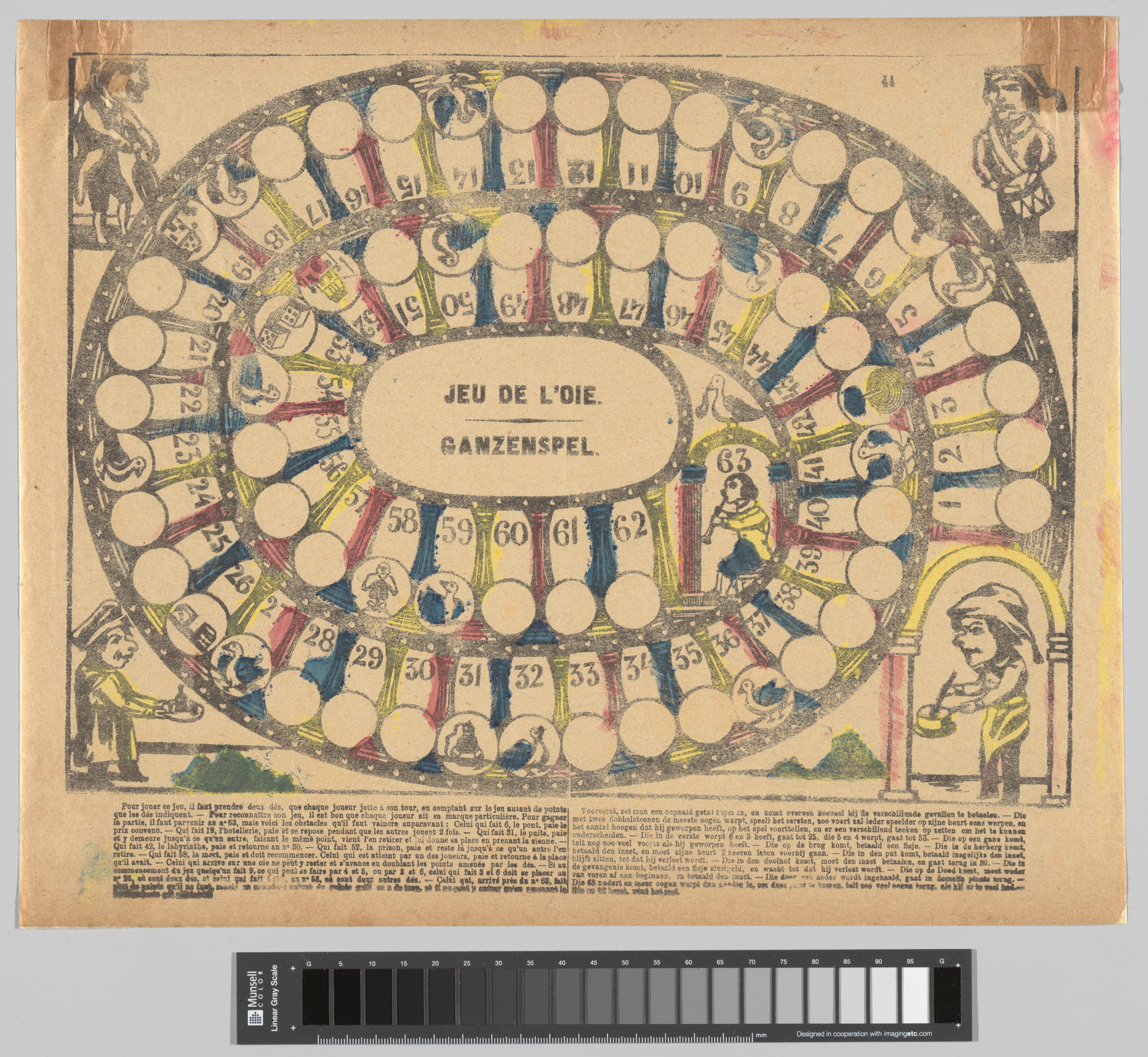 Ganzenbordspel met 63 speelvakken en onderaan het speelbord de spelregels.