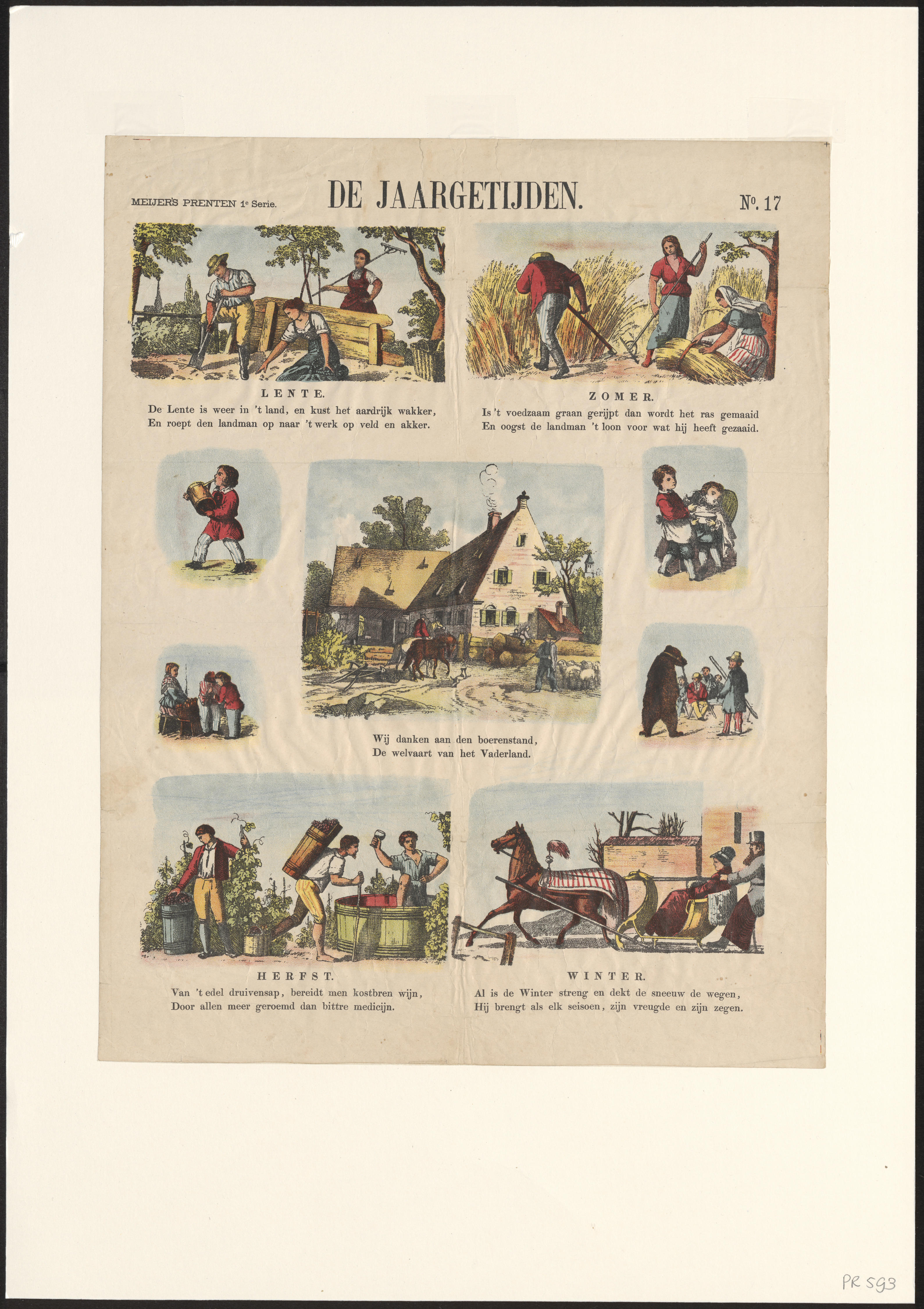 Prent met negen afbeeldingen van werkzaamheden en bezigheden die bij verschillende jaargetijden horen, gedrukt in lithografie. Onder vijf afbeeldingen staat een onderschrift. Op de prent staat geen uitgeversadres. Hij is toegeschreven aan De Ruyter & Meijer in Amsterdam.